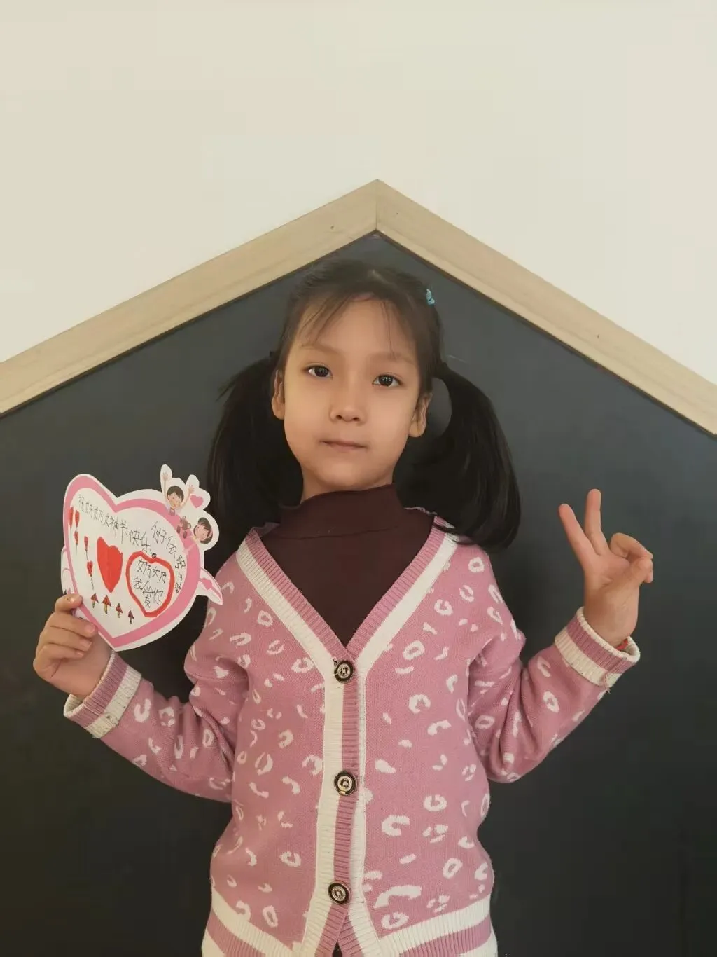 孩子们伏在桌前,神情专注,用画笔勾勒着心中的爱意:有的画下一家三口的温馨画面,有的写下歪歪扭扭却无比真诚的“我爱你”,还有的贴上了自己珍藏的小贴纸。每一张贺卡都是童真视角的独特表达,蕴含着最纯粹的情感。