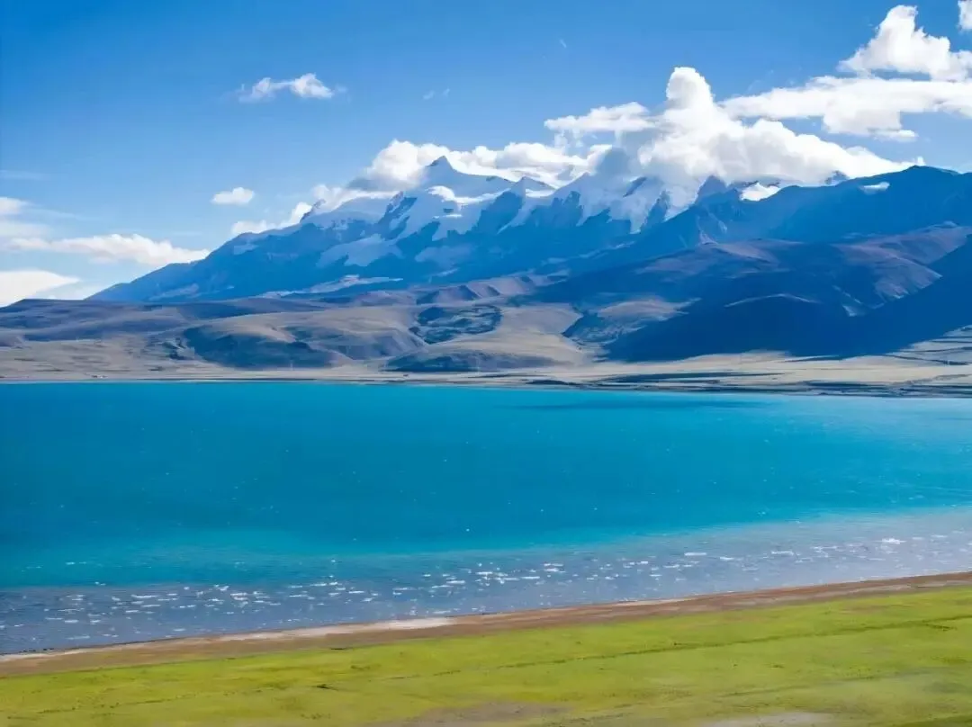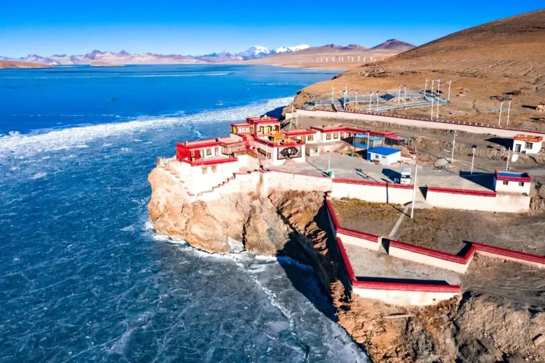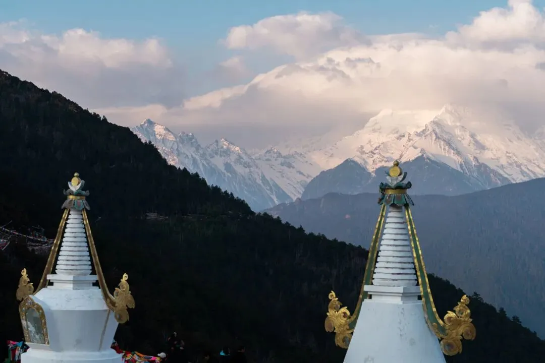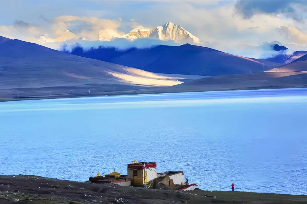 雪山、冰川、湖泊、藏寺院的相遇