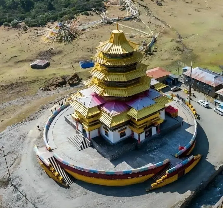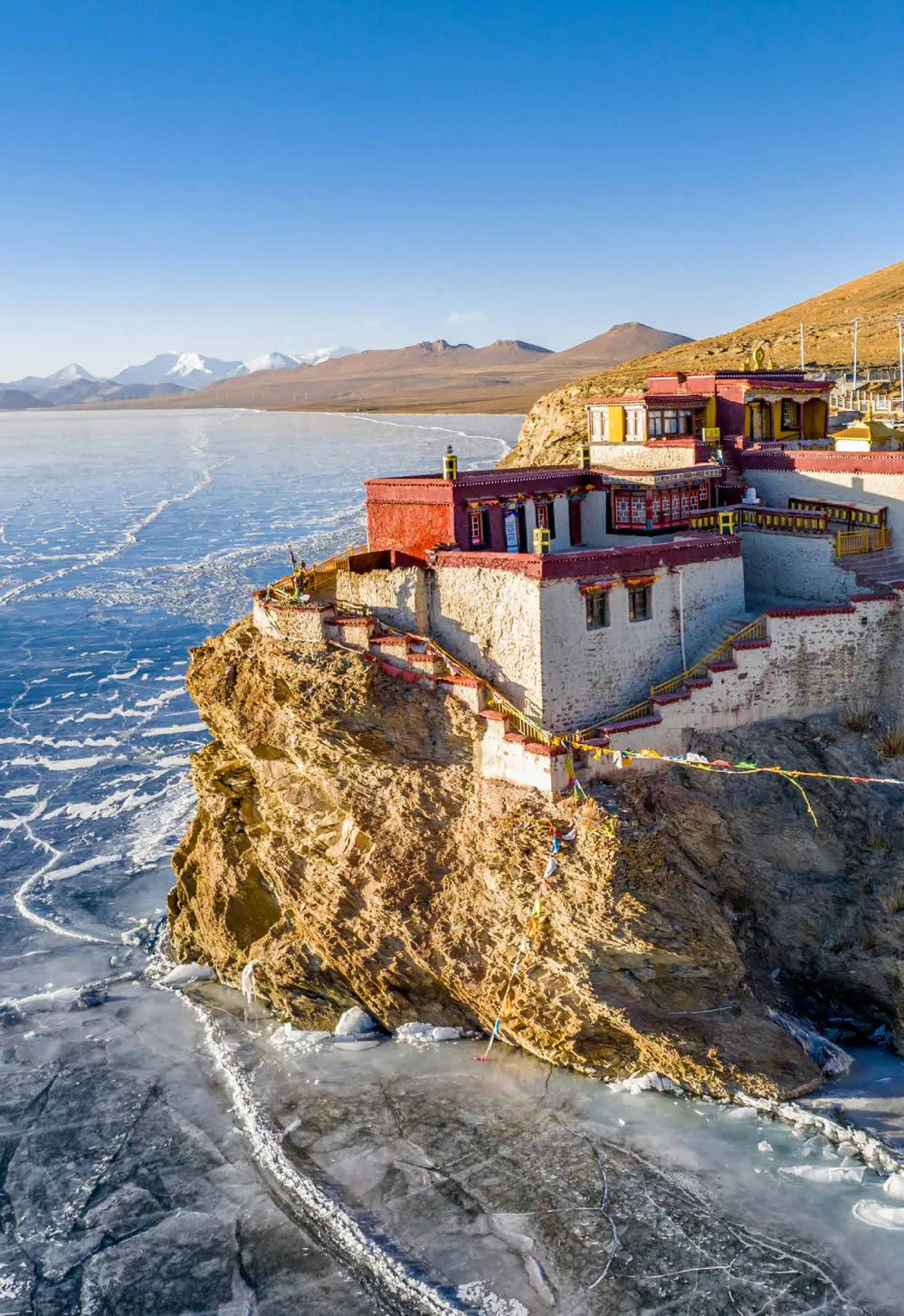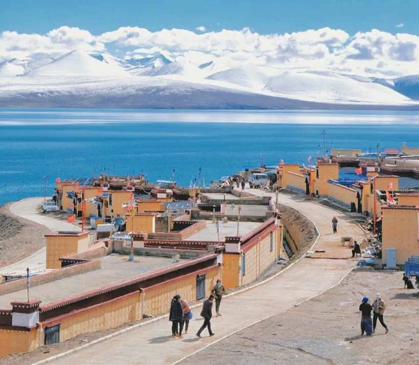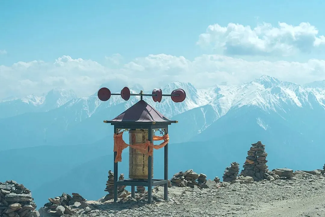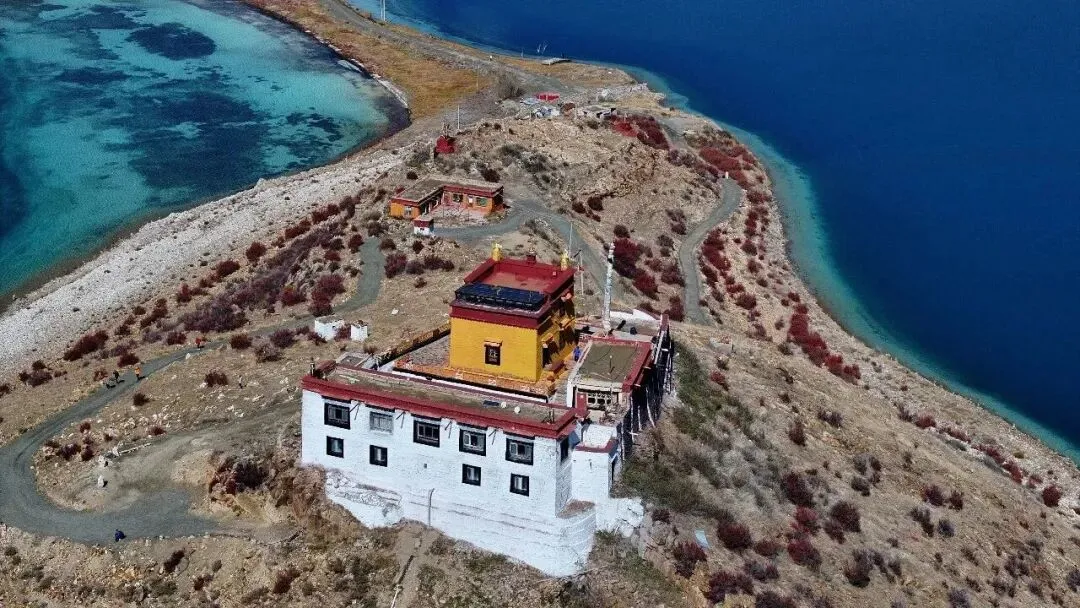 雪山、冰川、湖泊、藏寺院的相遇