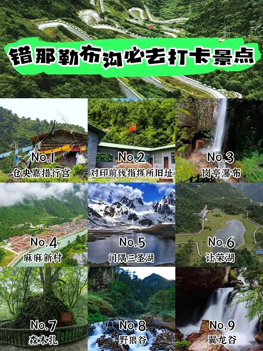 A线:金沙江大拐弯、梅里雪山飞来寺、日弄巴冰川(仁龙巴冰川)、墨脱县自然风景区、波密桃花沟、索松村桃花;B线:烈山古墓群、机甲寺、拿日雍错、勒布沟景区、错那千年古沙棘林、卡久寺、普莫雍措(推甘丹托门林寺)、羊卓雍措(日托寺)、雍布拉康(西藏第一座宫殿)、昌珠寺、桑耶寺;