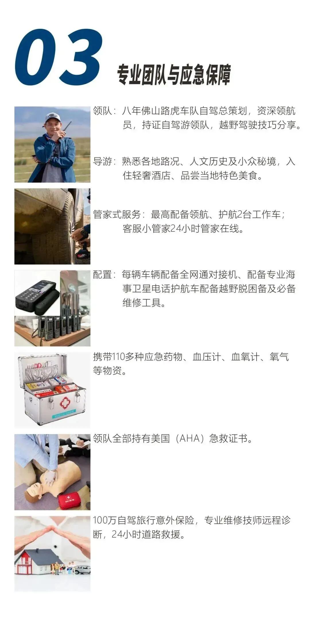 卫星电话、急救箱、拖车绳、应急电源、充气泵、千斤顶、救援工具、协助联系沿途汽修厂。