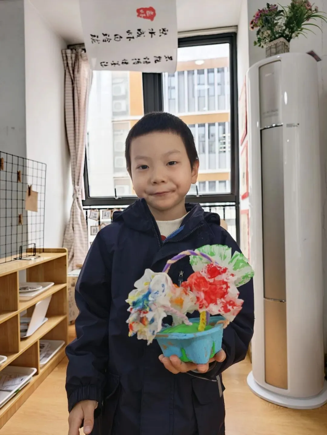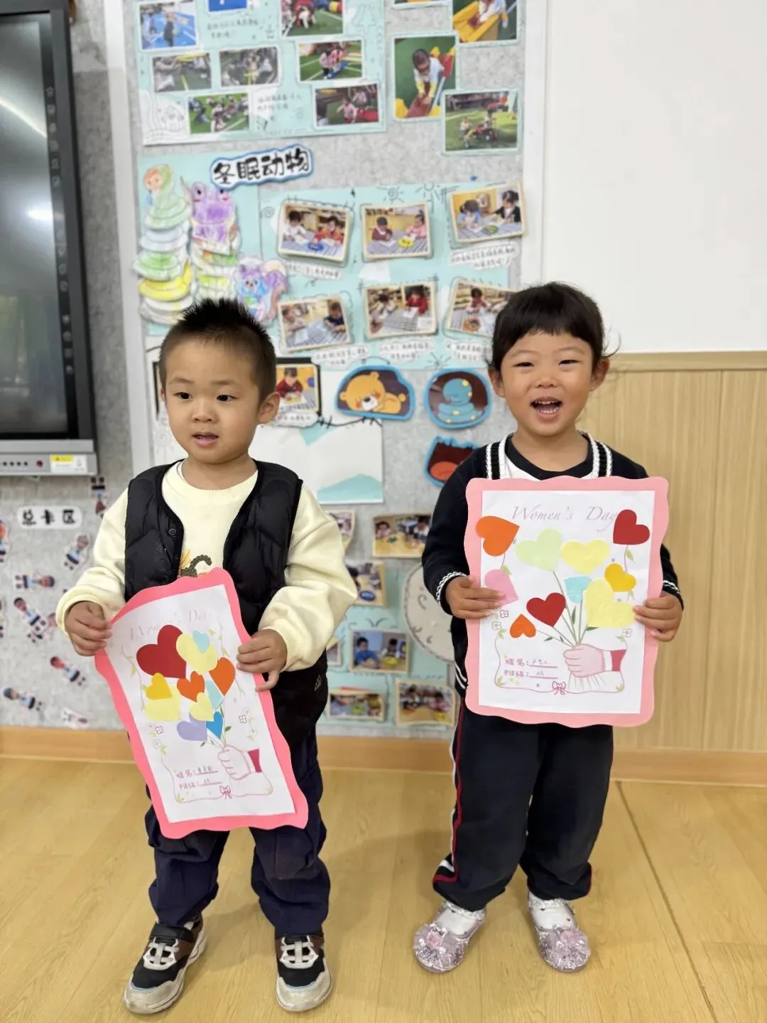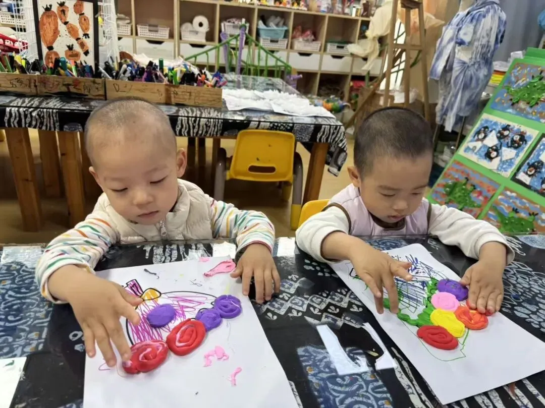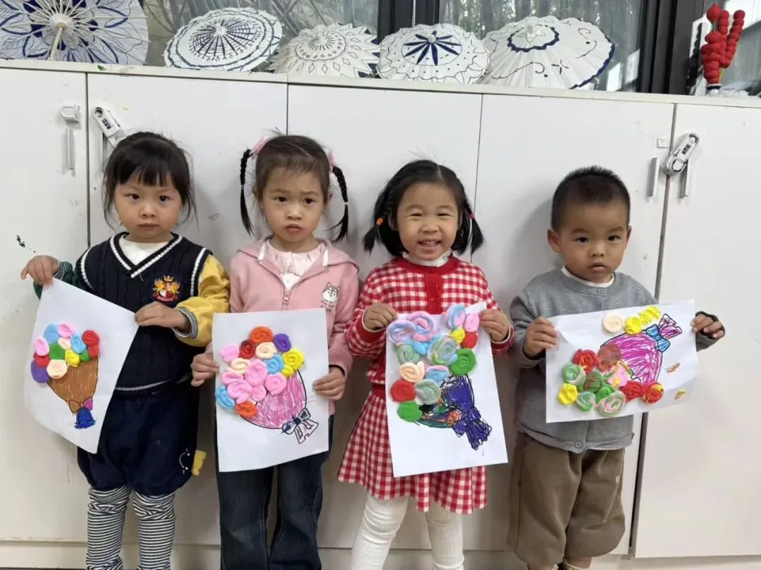 彩色的爱心像花朵一样在花茎上绽放。虽然小手还不太灵活,但每一个贴上去的爱心,都是宝贝们最真诚的表达。看着自己完成的作品,他们笑得比花还灿烂,仿佛在说:“妈妈,这是我送你的花哦!”