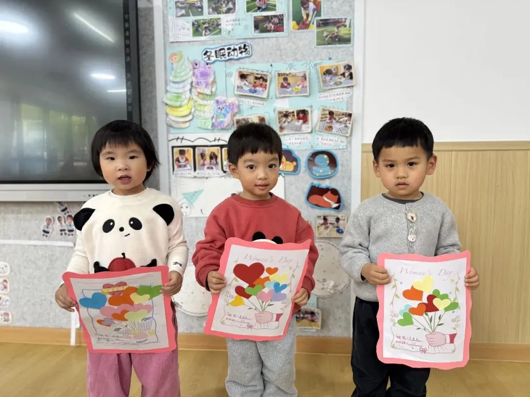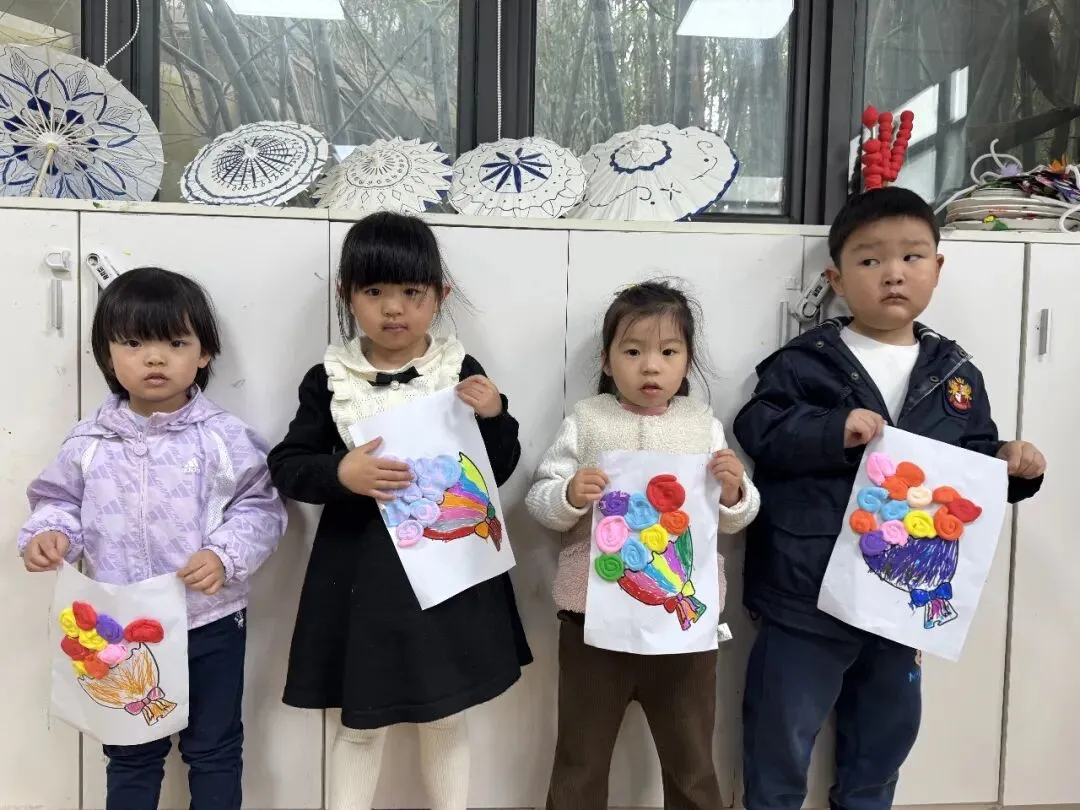 The younger children express their love in the most direct way. The teachers have prepared special drawing paper in advance—on the page, a little hand is holding the stems of a bouquet. The little ones carefully pick their favorite colored hearts and then gently stick them onto the flower stems.
