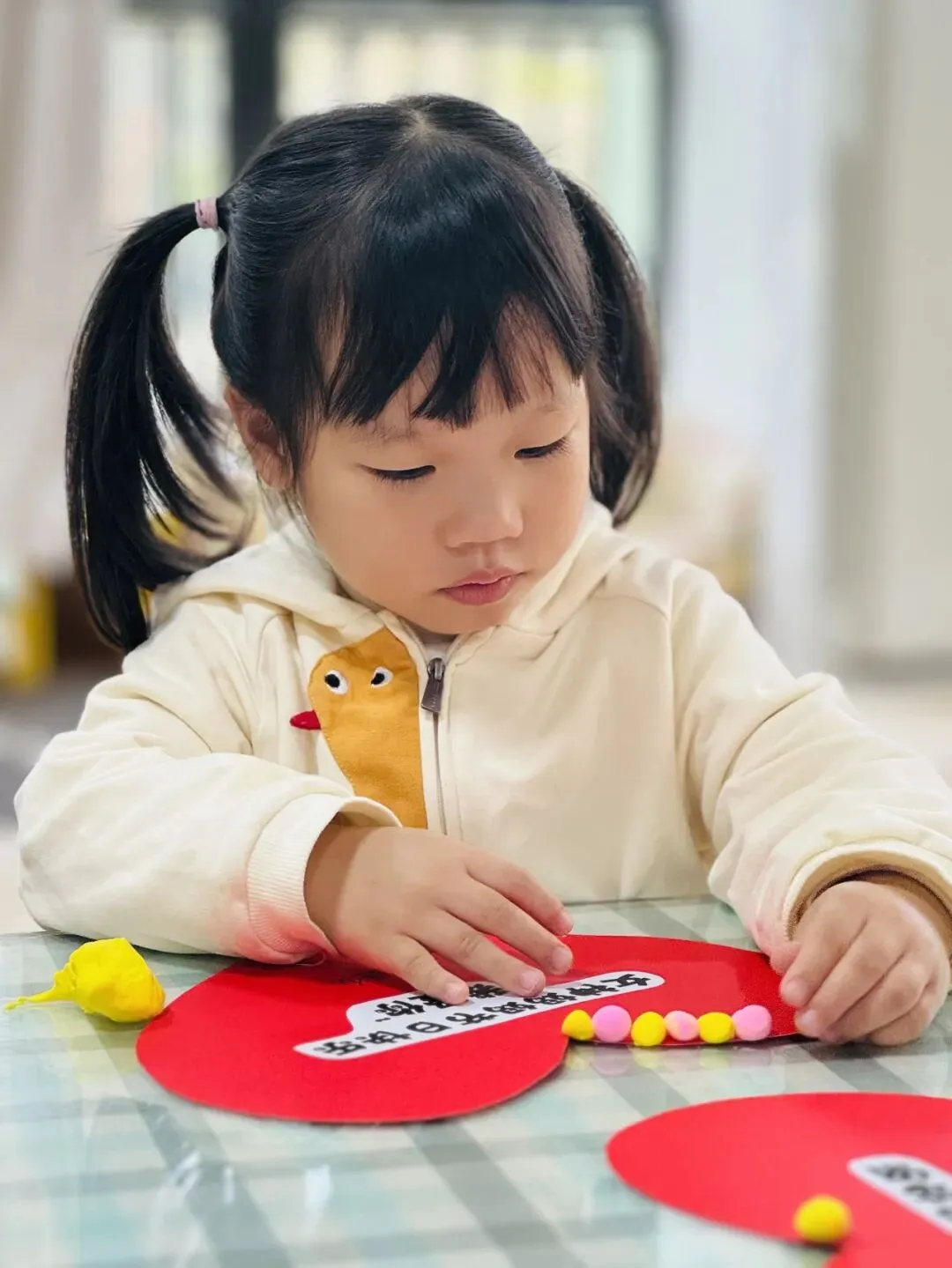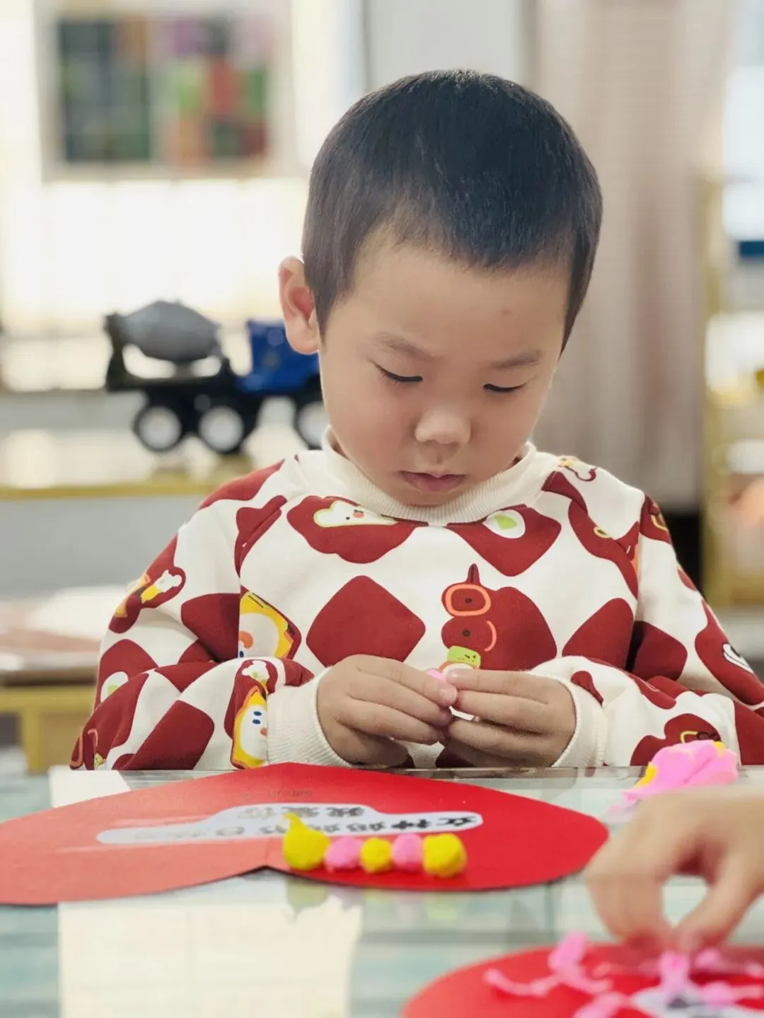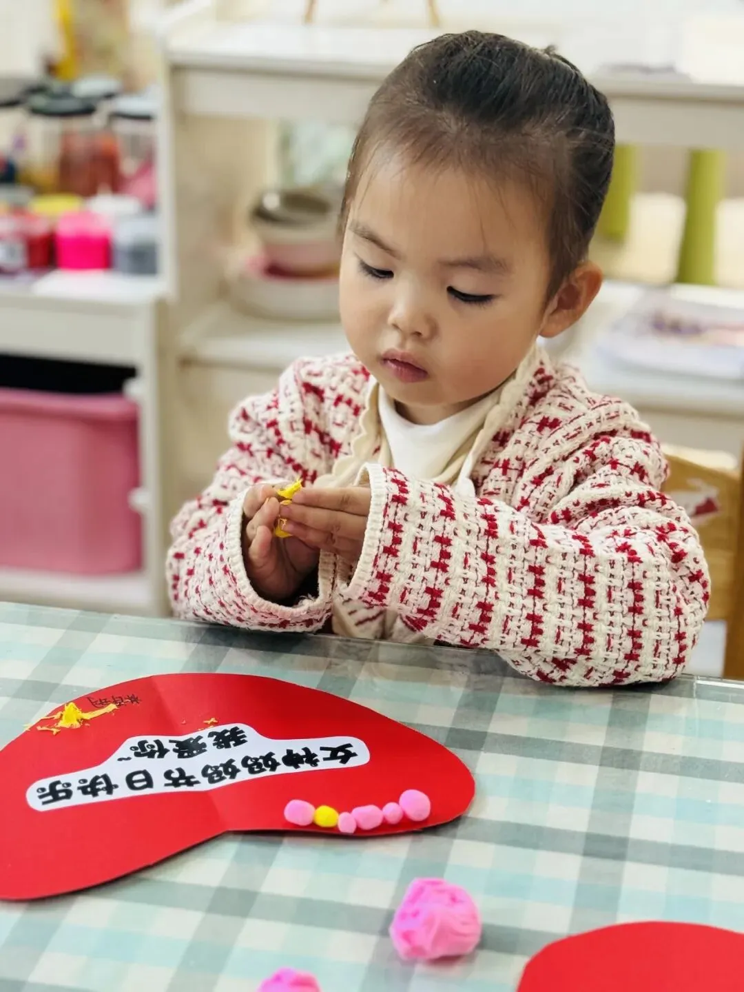 爱心形状的卡纸上正在上演一场色彩派对。孩子们搓出无数个迷你的彩色小圆球,像一颗颗甜甜的糖果。他们认真地沿着爱心边缘,将粉色和黄色的小圆球一颗一颗排列好。