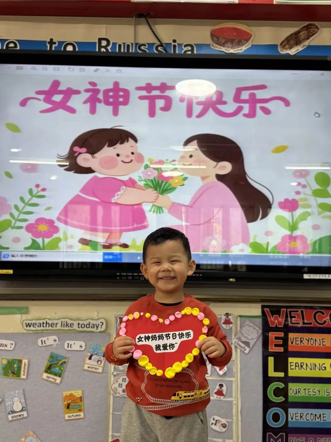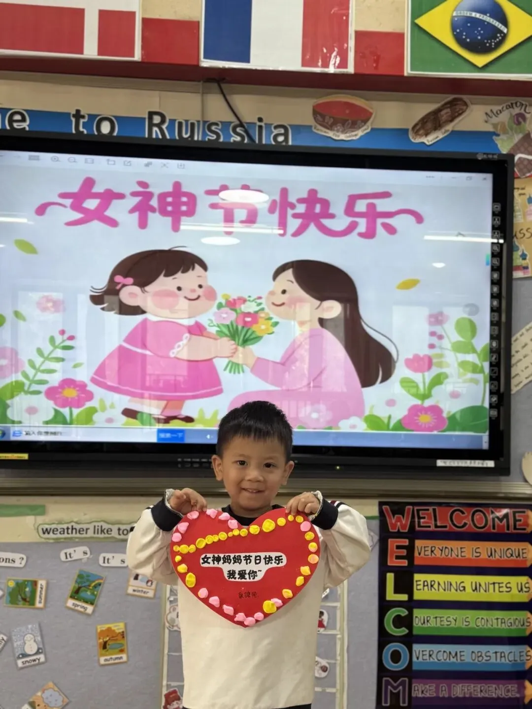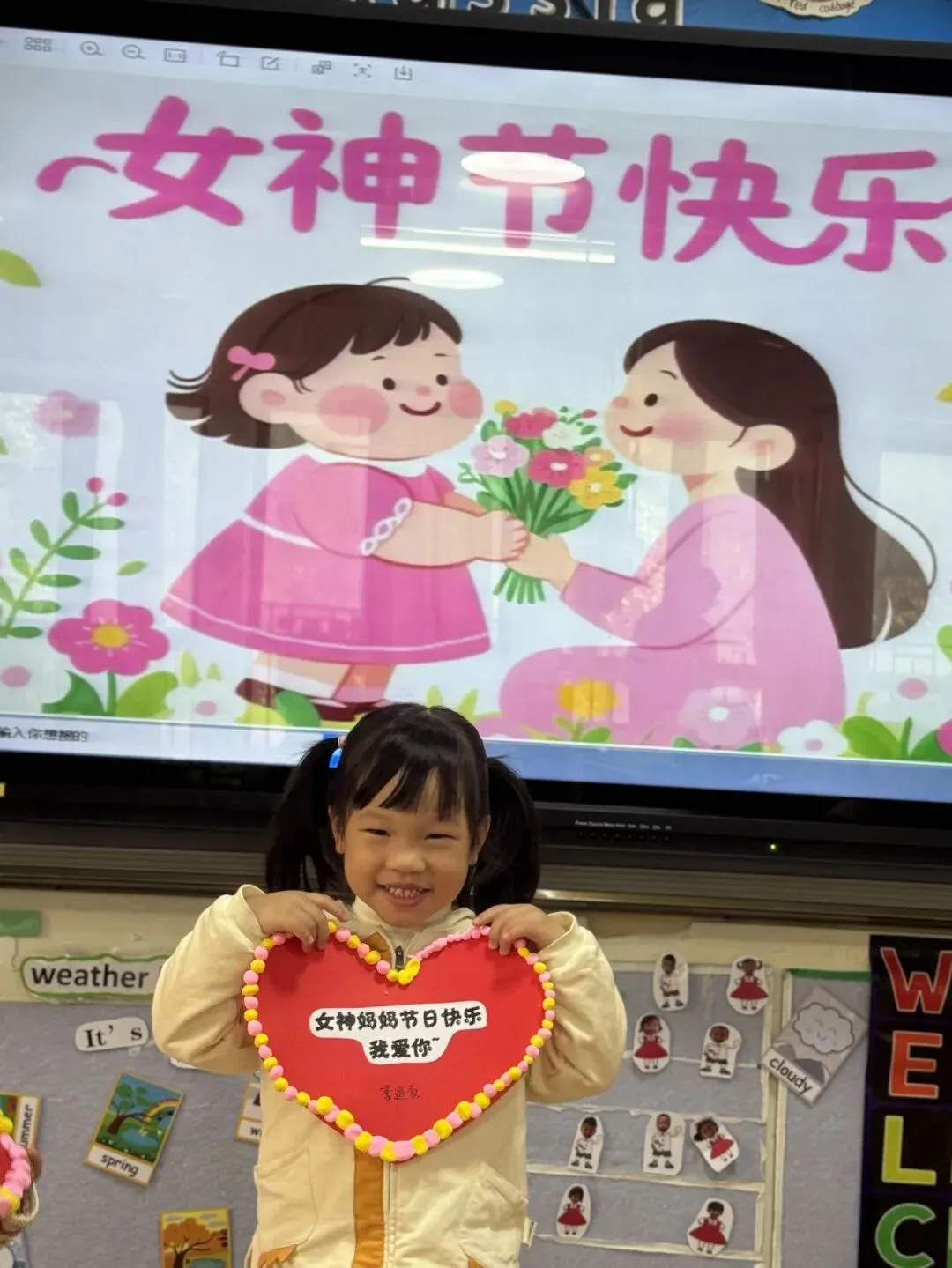 有些小艺术家可不按常理出牌,他们有自己的色彩规则——可能是粉黄的狂欢,也可能是彩虹色的跳跃。当整个爱心边缘被彩色圆球包围,中间贴上“女神妈妈节日快乐 我爱你~”的文字时,那份童真的告白让每一个看到的人都心头一暖。