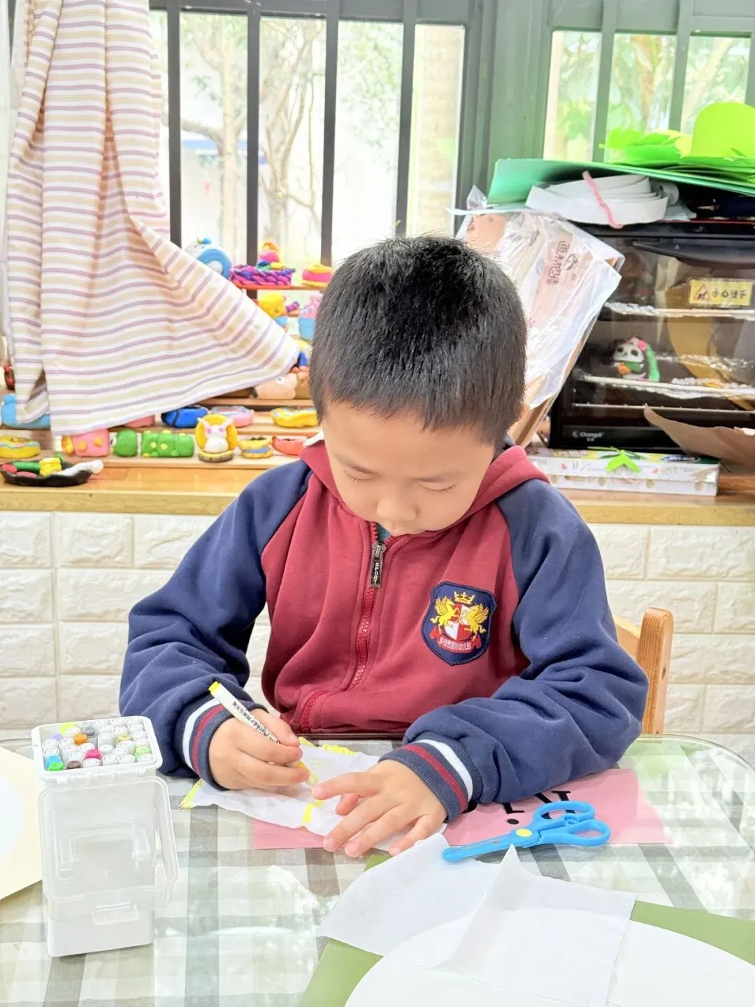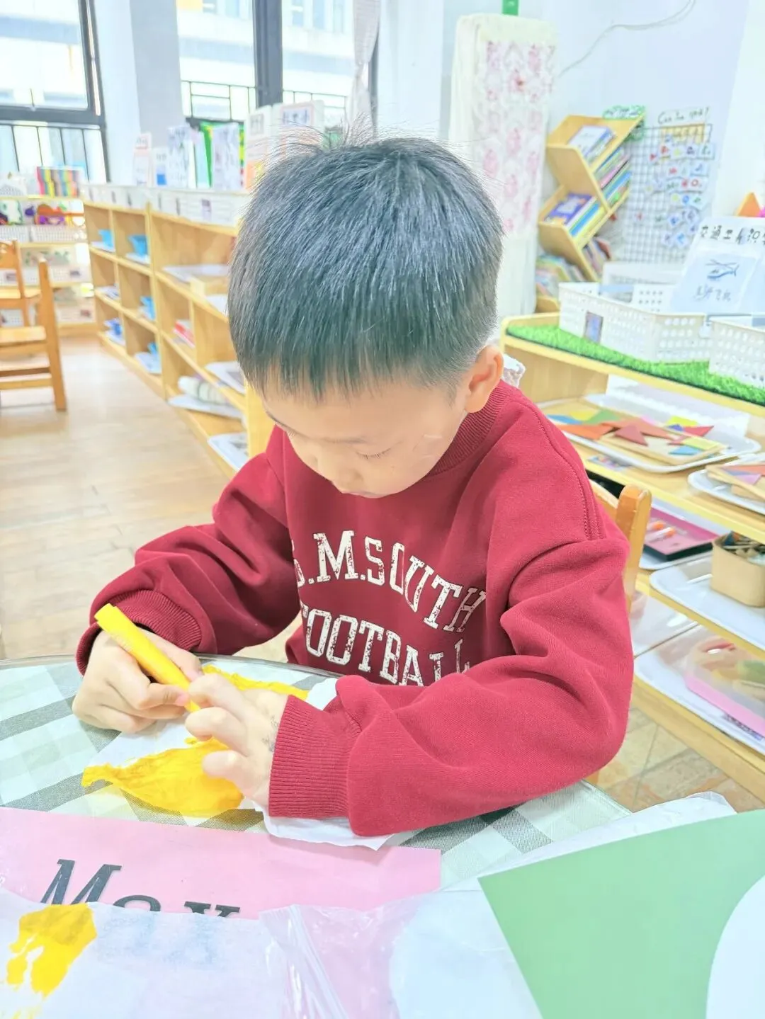 孩子们正沉浸在一场更有趣的艺术实验中。他们在画纸上铺好黏土基底,然后拿起画笔在卫生纸上涂抹着喜欢的颜色,用工具将这片彩色的小纸片戳进柔软的黏土里。