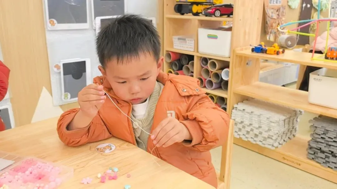 小一班的萌娃们用稚嫩的小手,开启了一场爱的创作。在老师的耐心指导下,孩子们小心翼翼地拿起一颗颗五彩斑斓的珠子,用纤细的绳子将它们串起。每一颗珠子都承载着孩子对妈妈满满的爱,每一次穿绳都是他们用心的表达。