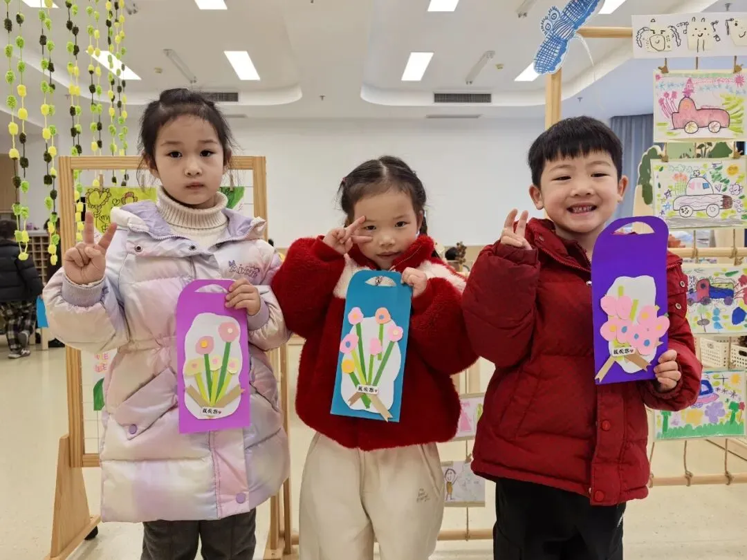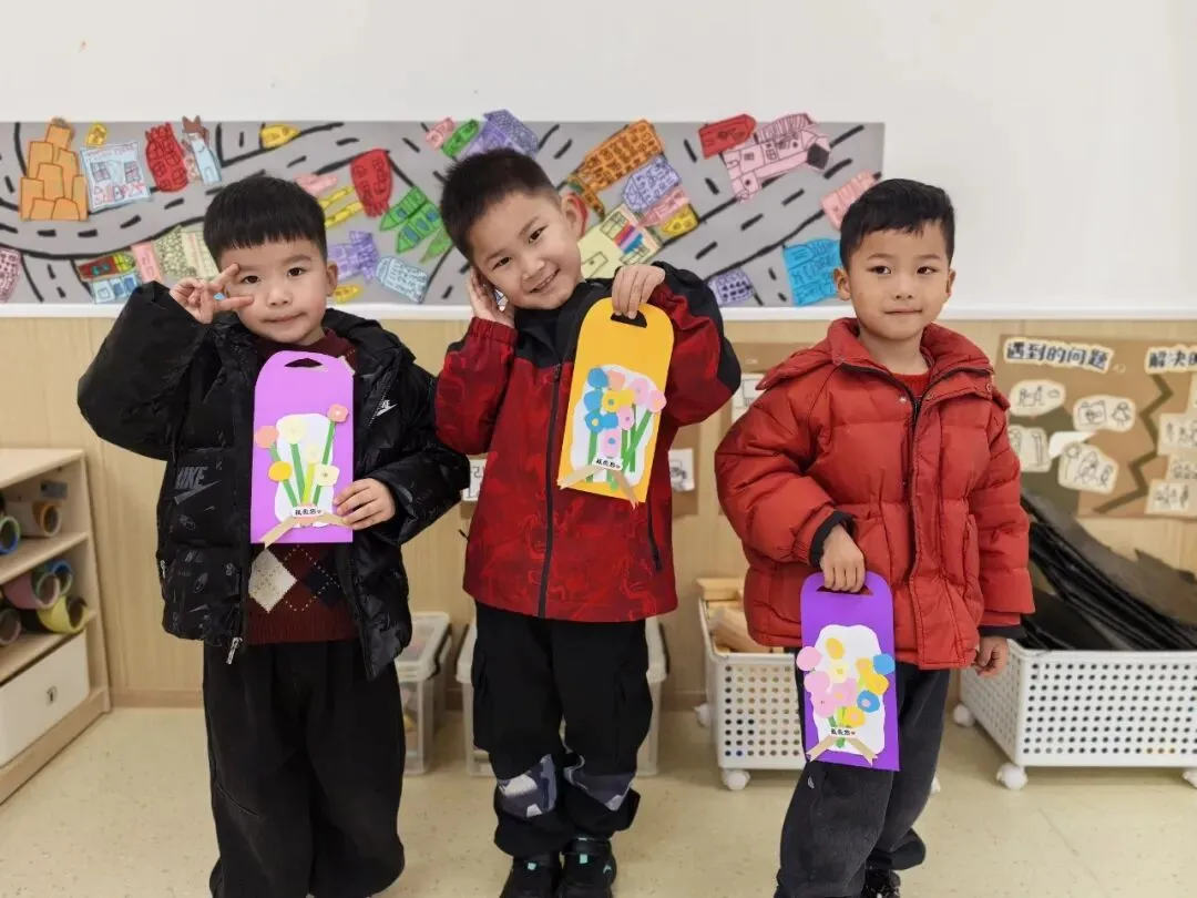 中二班的宝贝们则用彩纸和小手,为妈妈、奶奶和外婆制作了充满爱意的花束礼物。每一朵小花都藏着纯真的感谢,让这个春天显得格外温暖。