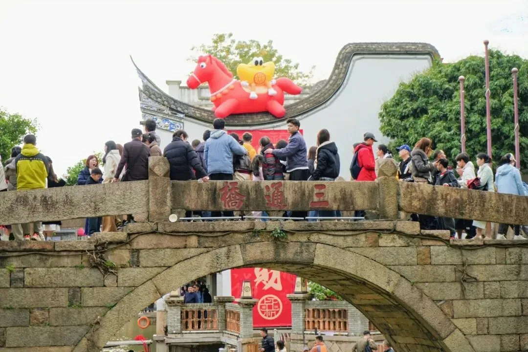 上下杭马年福运主题美陈年味十足,红色马头造型、好运拱门、车票墙与喜庆灯笼相映成趣,在百年古厝间营造出温馨又热闹的新春氛围。