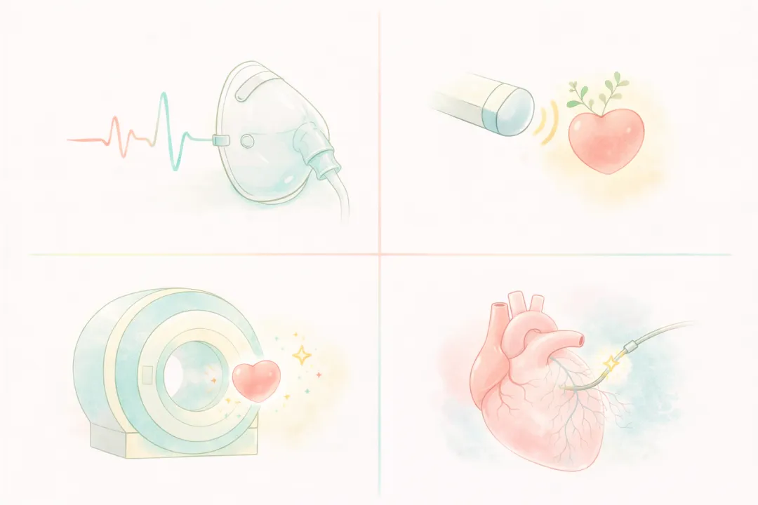 负荷超声心动图 (Stress Echo)无电离辐射,通过让心脏“增加负荷”,超声探头能精准捕捉微小缺血引发的异常。