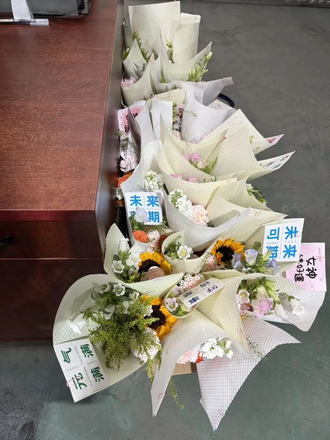 礼物送达的瞬间,办公室和车间里都洋溢着喜悦的氛围。大家手捧鲜花与礼盒,脸上的笑容比春日阳光还要灿烂。
