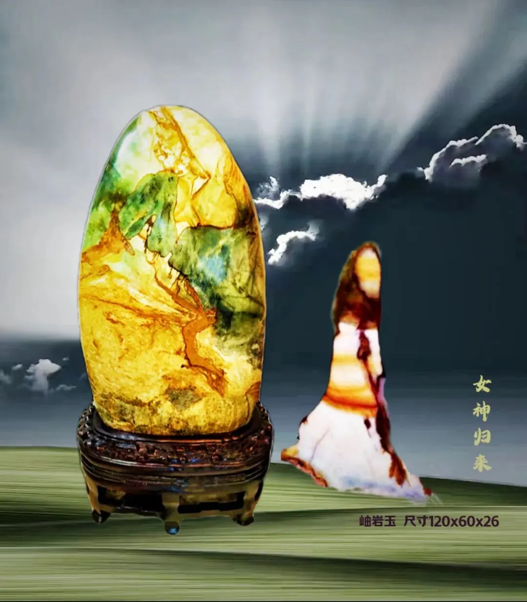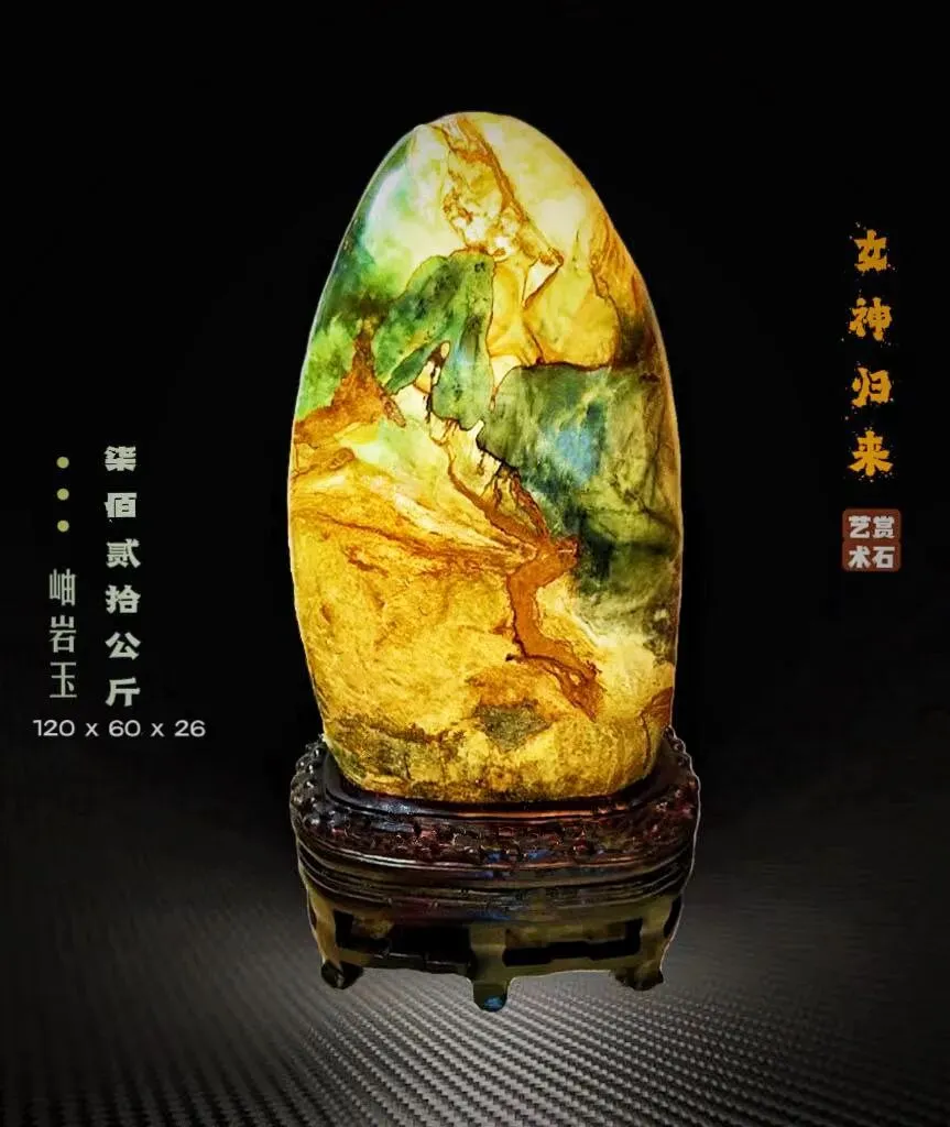在浩瀚的奇石艺术殿堂中,总有一些作品能够超越时间的限制,以天工造物之姿,叩响人类审美的心门。这方名为“女神归来”的岫岩玉画面石,以其硕大的体量、斑斓的色彩,以及令人惊叹的具象画面,被誉为“天下第一具像”女神石。它不仅仅是一方石头,更是一部由大自然用数亿年光阴书写的史诗,一首凝固在地质层理间的色彩交响诗。