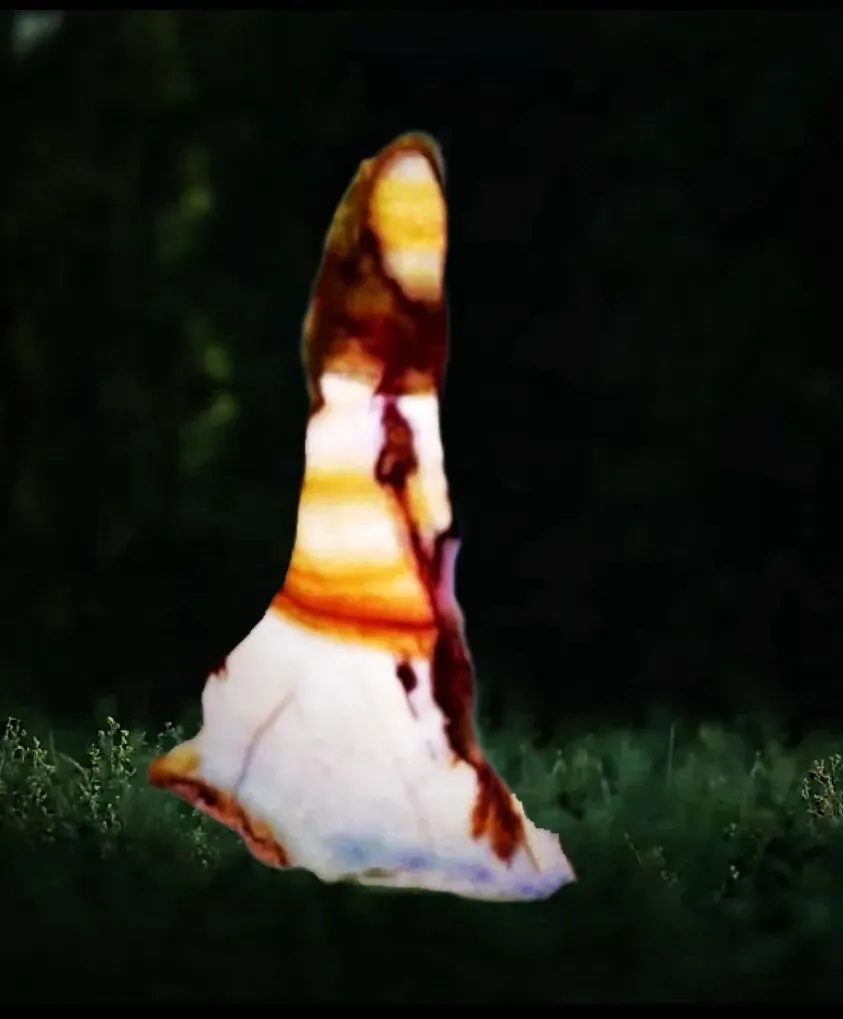 定睛细看,一位亭亭玉立的女神正从林间款款走来。大自然的构图精准得令人敬畏:女神的身形修长而丰韵,比例极为协调生动,完全符合古典美学的人体黄金分割。她头戴方巾线帽,纹理自然垂落;上身着紧致短衣,下身配飘逸长裙,服饰层次分明,搭配得体。更为精妙的是,石中色彩的微妙变化恰好勾勒出了她侧身回眸的姿态,使得整个画面虽静而动,虽无声而胜有声。