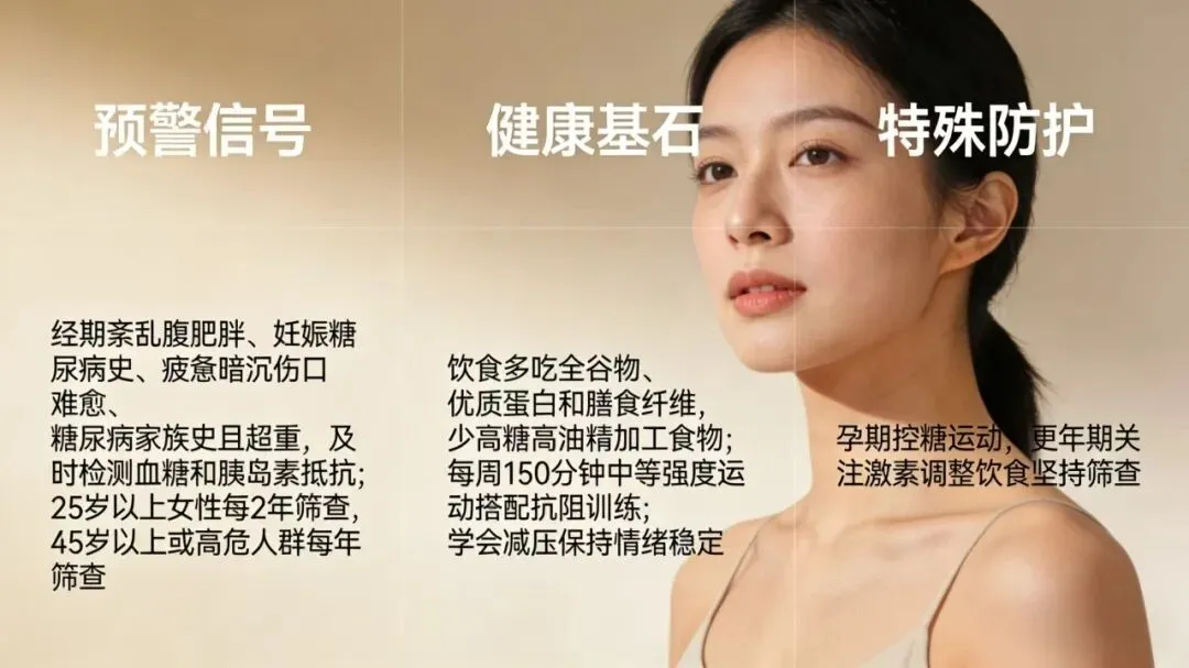 • 建议:25 岁以上女性每 2 年查一次空腹血糖、糖化血红蛋白;45 岁以上或高危人群每年筛查。