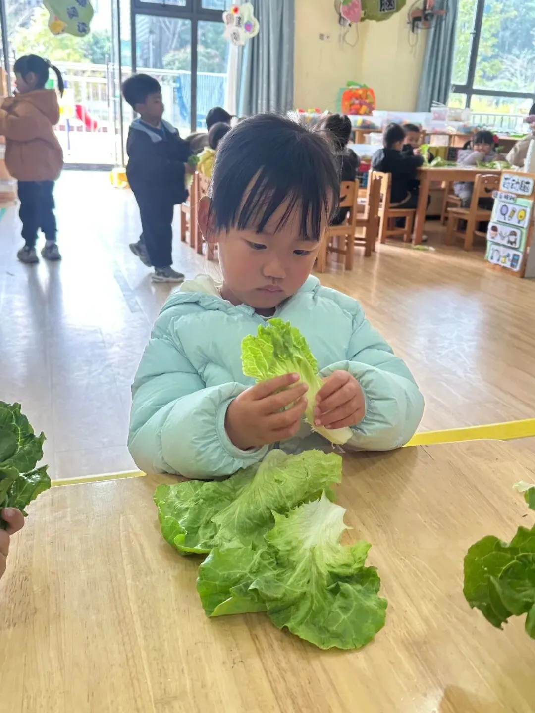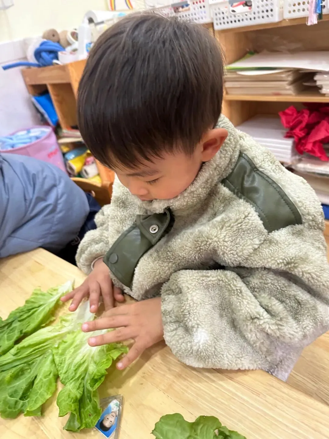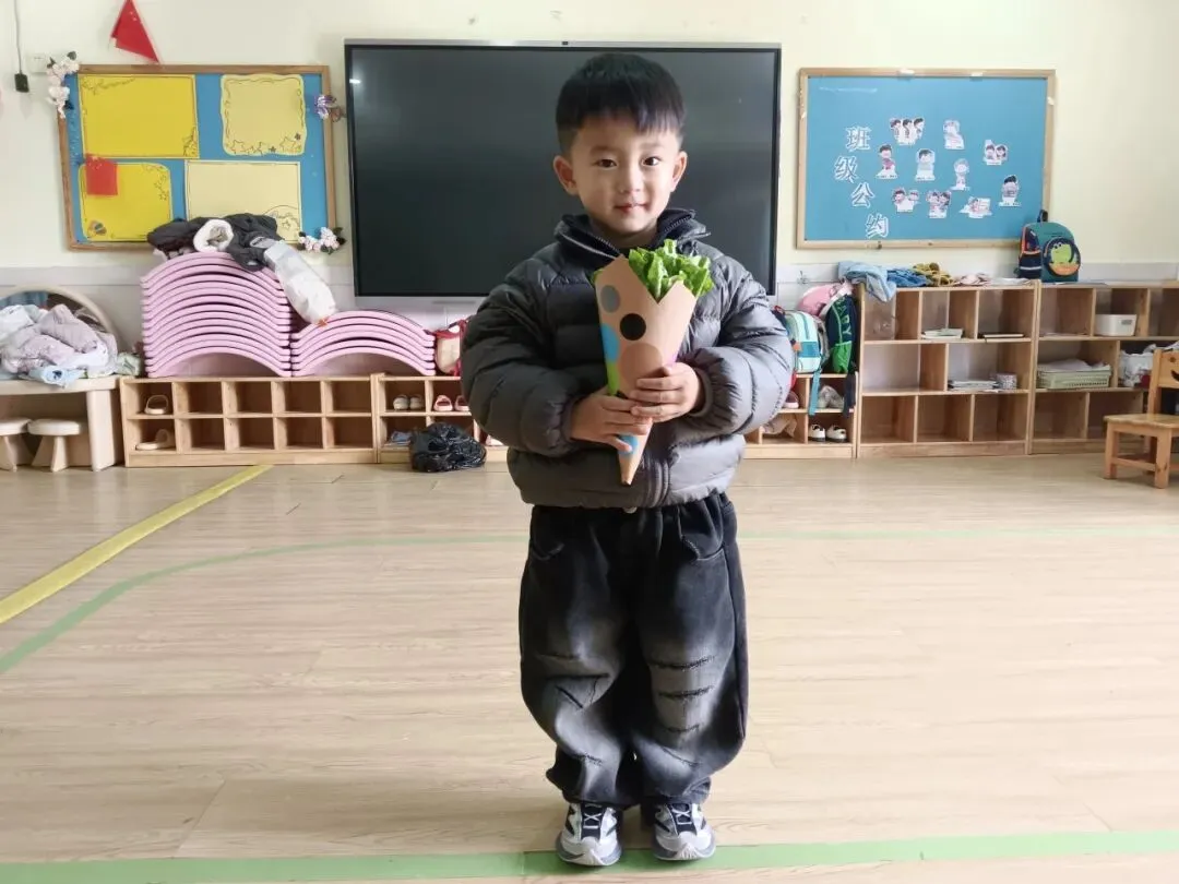 萌娃们化身小小花艺师,解锁超有趣的生菜花制作!老师提前备好干净的生菜和漂亮纸筒,宝贝们小手虽小却格外认真,把生菜小心放进纸筒,每一朵独一无二的生“财”花,都藏着对妈妈最特别的祝福。