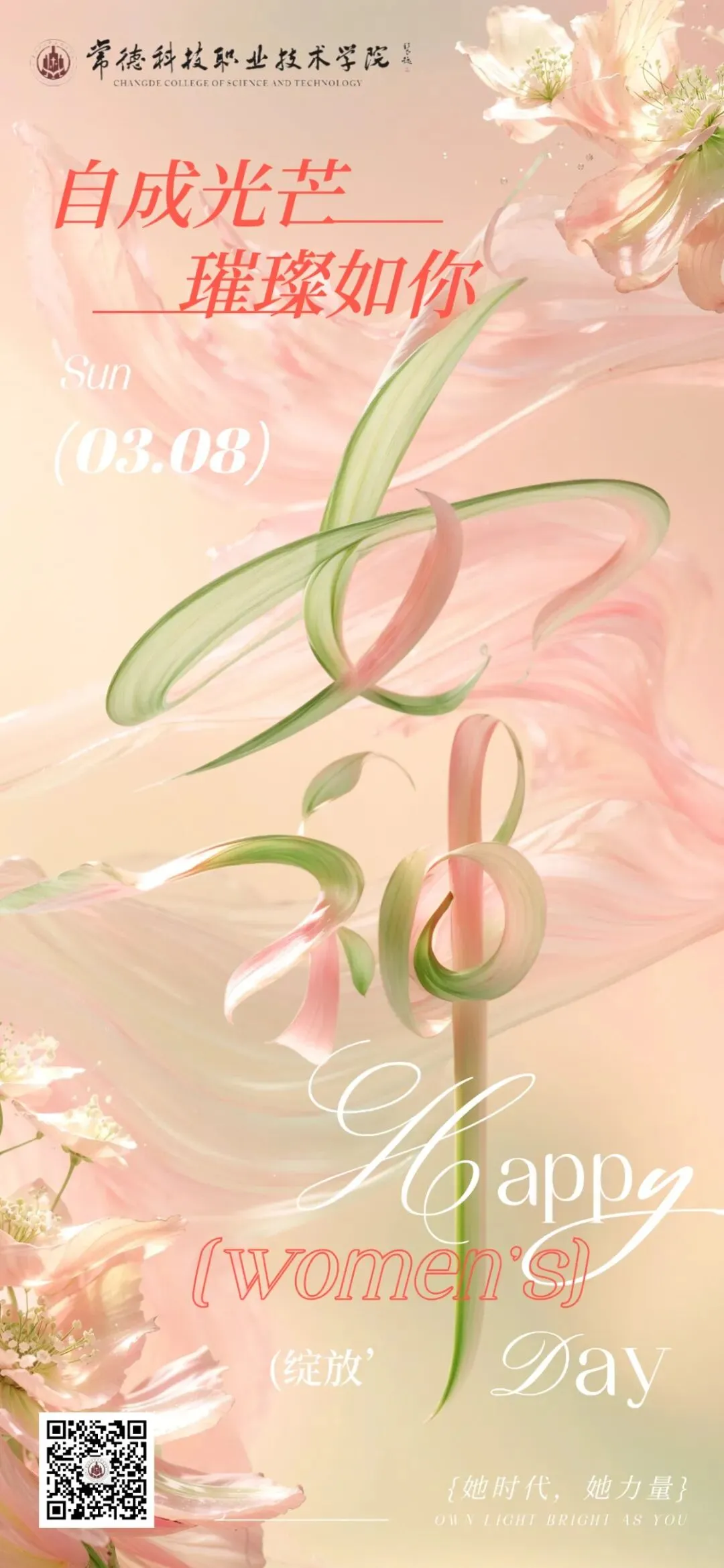 春风十里,不如有你;芳华灼灼,不负韶华。再次祝愿全体女教职工、女同学们节日快乐、身体健康、工作顺利、学业进步、阖家幸福、芳华永驻!愿你们眼里有光、心中有爱、脚下有力量,在人生的赛道上奋勇争先,在常科的沃土上续写巾帼华章,与学校同心同向、共赴美好未来!
