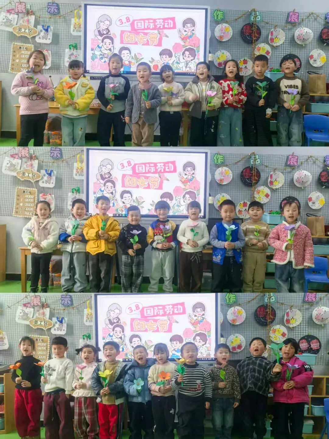 流潭幼儿园萌娃们,在老师的带领下,通过谈话、视频、故事等活动了解节日的来源,知道了三八妇女节的来历,理解节日的意义,学会感恩、关心身边的女性长辈。