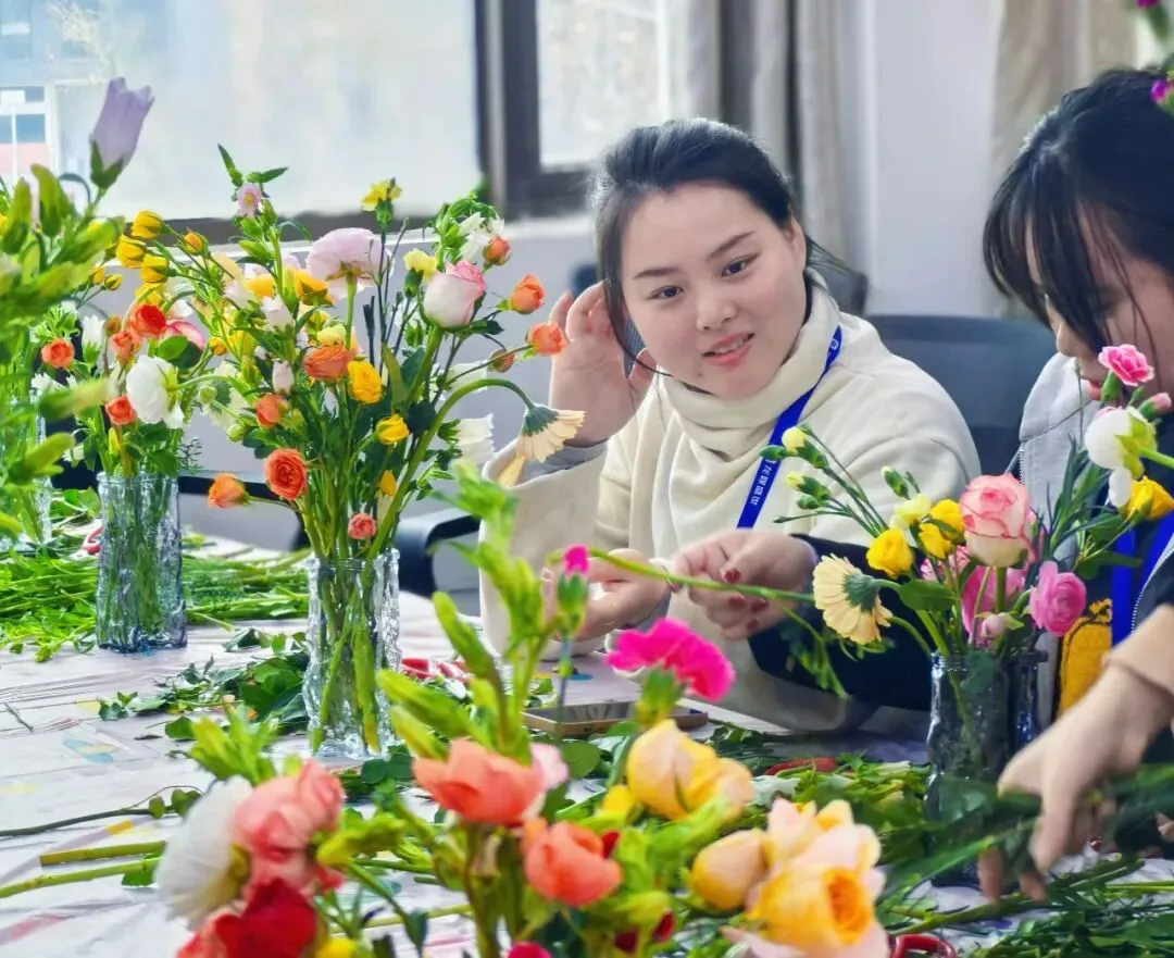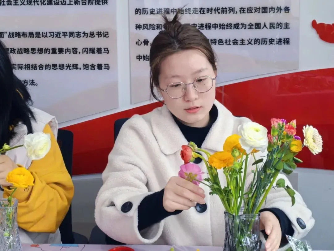 现场更有花艺爱好者为大家进行讲解,从花材识别、色彩搭配、修剪技巧到鲜花养护详细的插花知识让在场女同胞们眼前一亮、跃跃欲试。讲解结束后,大家纷纷投入到插花创作中,化身“花艺设计师”,根据自己的审美与喜好,挑选花材、修剪枝叶、搭配色彩、摆放造型。现场氛围热烈而温馨。指尖翻飞间,原本零散的花材,在大家的巧手下,变成了一束束独具匠心、充满生机的花艺作品。每一朵花、每一片叶的摆放,都承载着大家对生活的热爱,对美好的向往,更践行着“爱己悦己”的生活态度。当亲手完成的插花作品呈现在眼前时,每个人的脸上都洋溢着幸福的笑容,成就感与幸福感满满。