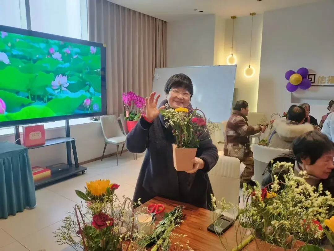 看着自己亲手完成的花艺作品,阿姨们脸上满是成就感与幸福感,笑容温柔又灿烂。