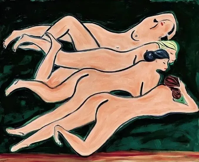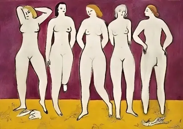 30年代,转折发生。家族破产、妻子离去,经济困顿如潮水涌来。画布上的衣服开始褪去。那些曾经端坐的女子,渐渐卸下衣衫,露出身体。粉红色的裸女渐渐消失——她们的线条开始变得深硬,面孔渐隐,身份消失;具象的东西被抽离出来,朝着抽象走去。他不再画“某个人”,他开始画“人”背后的某种存在?兴许画面越简单,内涵就越复杂吧!