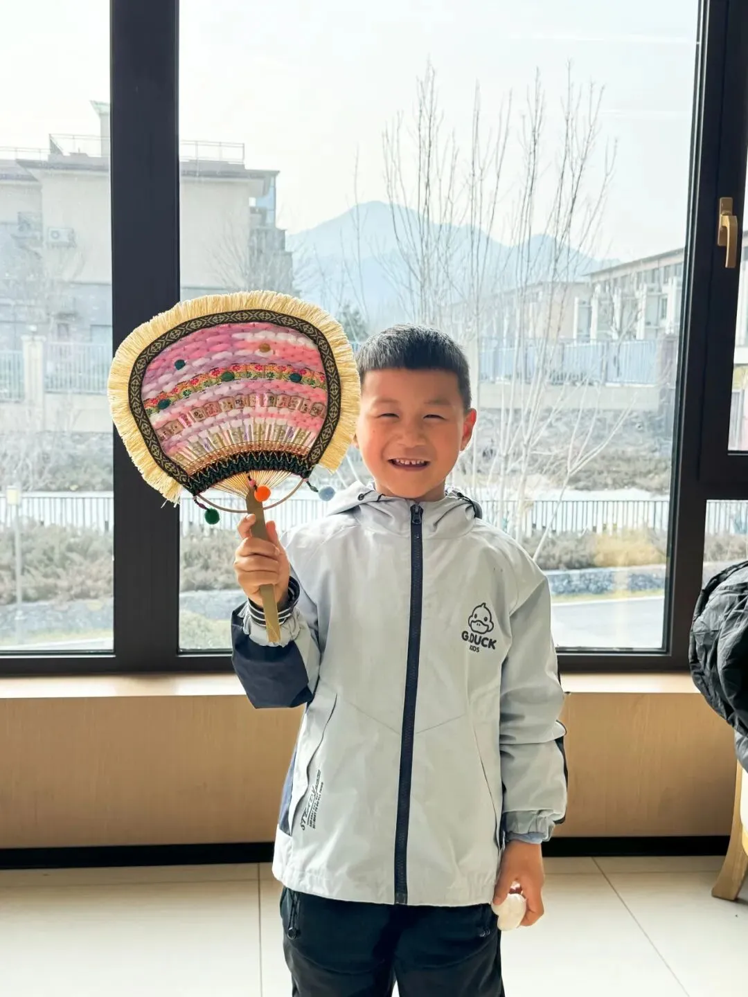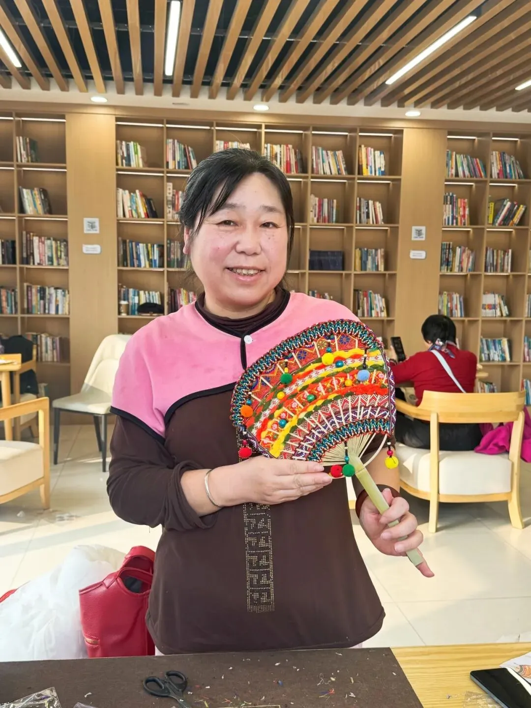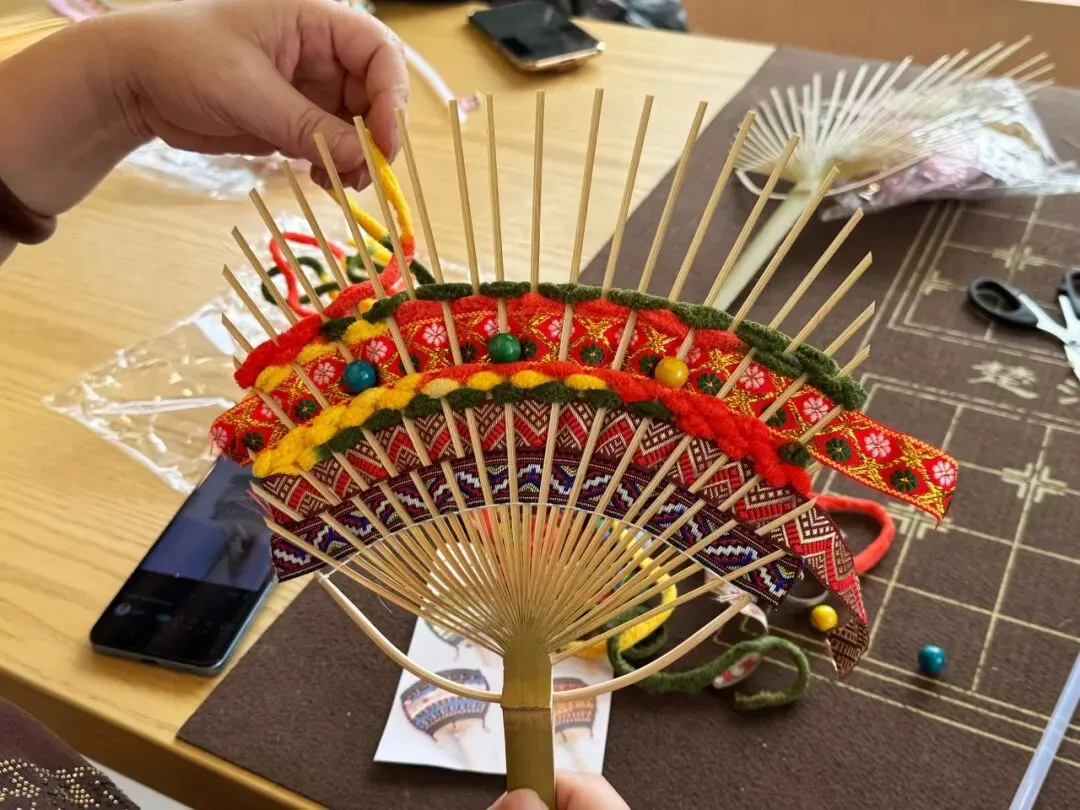 3月7日下午,我们邂逅了非遗壮锦之美。不同于传统的刺绣,壮锦的编织是一场来回穿插的指尖舞蹈:大家手持彩线穿梭、交织,让原本素净的扇面,渐渐被斑斓的民族纹样填满。