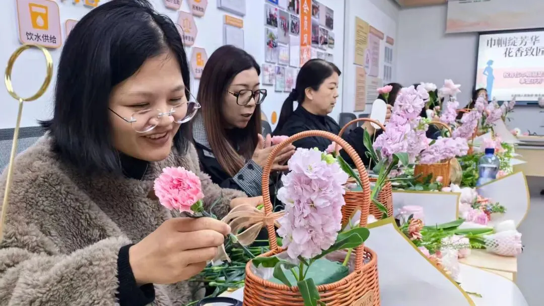 活动期间上虞农商银行永和支行业务经理将金融理财、防诈宣传与花艺知识有机结合,分享财富管理小技巧,并送上真挚的节日祝福。花艺老师给参与者讲解了花材的品种、花语寓意及养护方法。在老师指导下,大家轻剪枝叶、巧搭花材,将零散的花材变成一个个错落有致、清新雅致的花艺作品,现场花香与欢笑声交织成温馨的乐章。