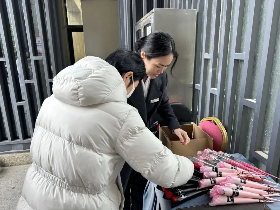 清晨九点半,园区还浸在温柔的晨曦里,南区北门、北区西门的角落已悄然泛起暖意。物业管家们提前抵达岗位,整理着一束束娇艳的鲜花,带着满满的诚意,等候每一位女业主的出现。