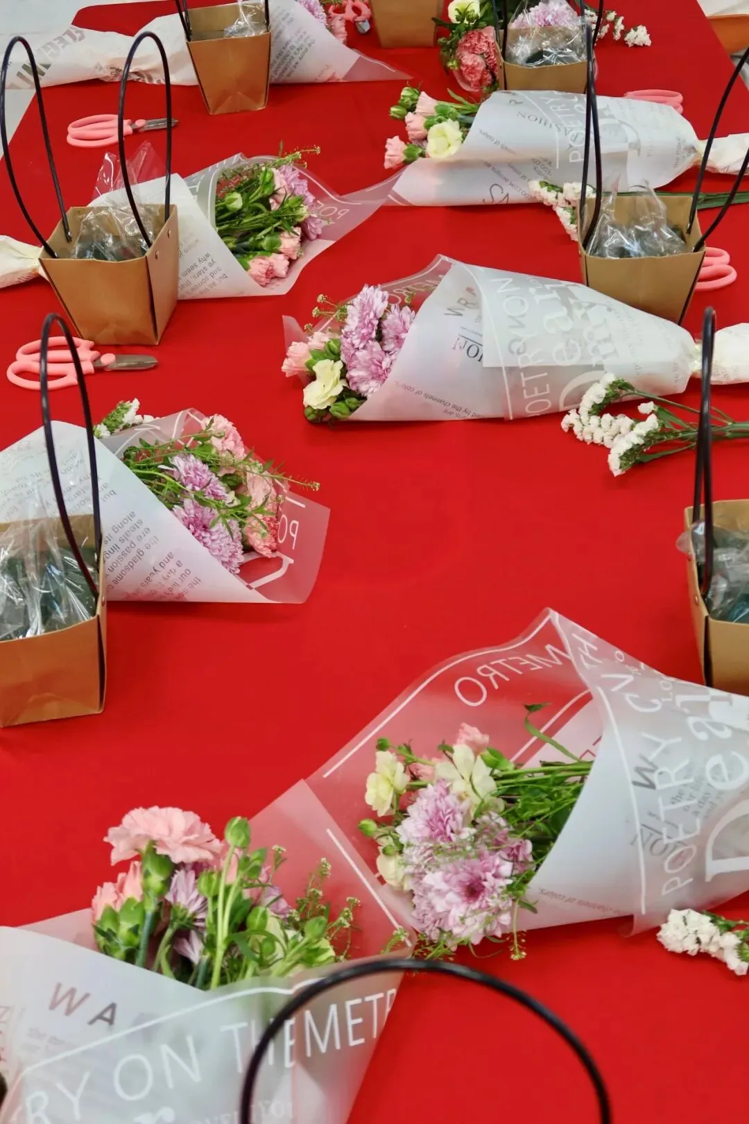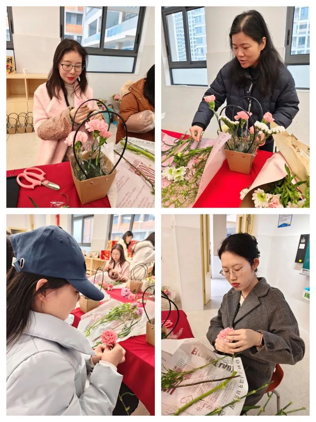 养生分享结束后,温馨雅致的插花环节正式拉开帷幕。活动以粉色系花材为主,提前备好的各类鲜花色泽艳丽、姿态舒展,搭配精致的花器与工具,让整个美术室都弥漫着淡淡的花香。活动分为两组有序开展,老师们在轻松愉悦的氛围中体验花艺之美。
