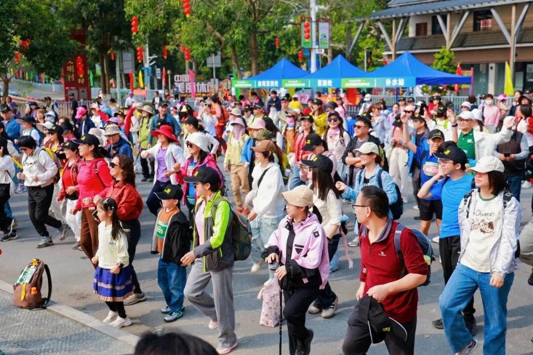 活动当天现场人气爆棚,参与者有序签到打卡、领取物料,徒步老友、亲子家庭、节日出游的友人齐聚一堂。