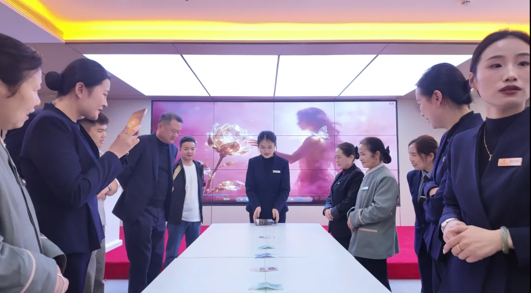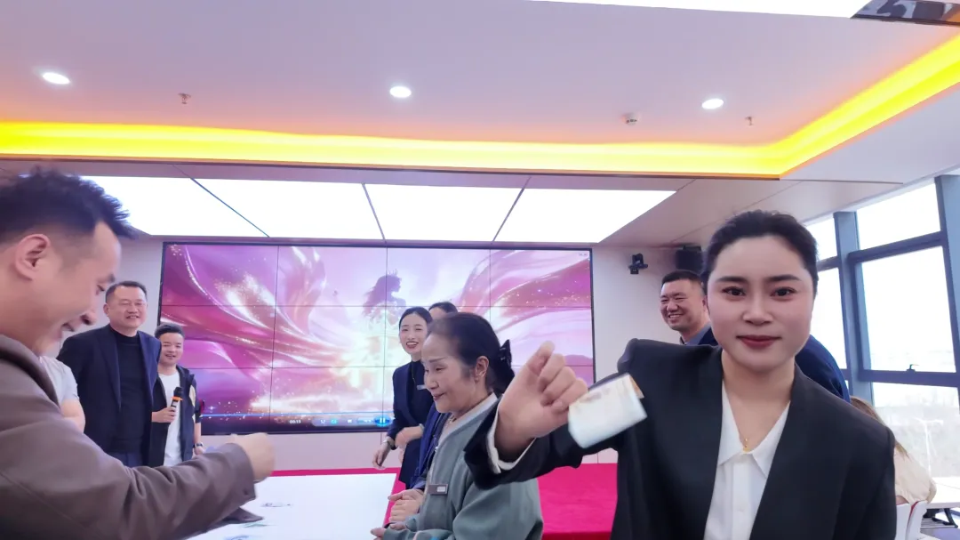随后的游戏互动环节更是将现场气氛推向高潮。趣味游戏“财源滚滚”中,通过击鼓传花选中的女神们滚动饮料瓶赢取现金奖励,欢笑不断;“女神出题·男神渡劫”环节中,男员工们面对女神们的提问机智应对,答错者接受趣味惩罚,答对者则收获夸赞与比心,现场笑声掌声此起彼伏。