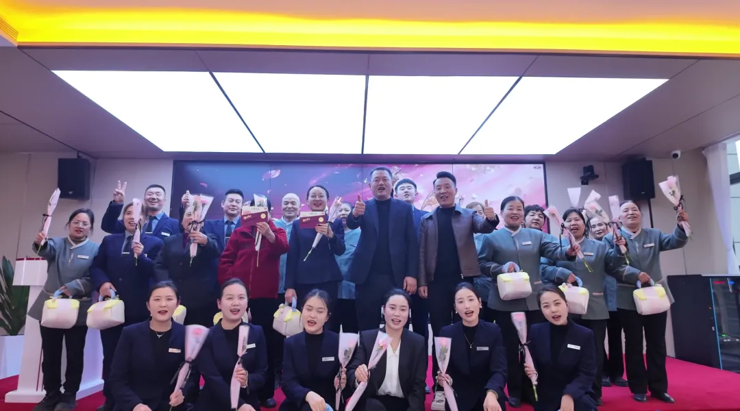 在拍照合影环节,女神们手持贺卡与伴手礼,齐声高呼“做自己的女王”,自信与美丽在镜头前绽放。随后,全体男女员工共同上台,手持玫瑰花,齐声祝福:“愿你一生被爱!永远自在坦荡!女神节快乐!”画面温馨感人。
