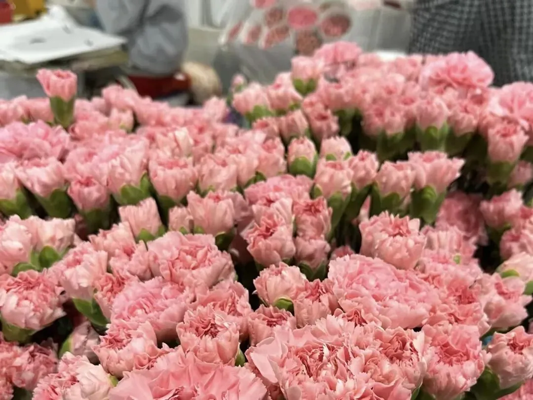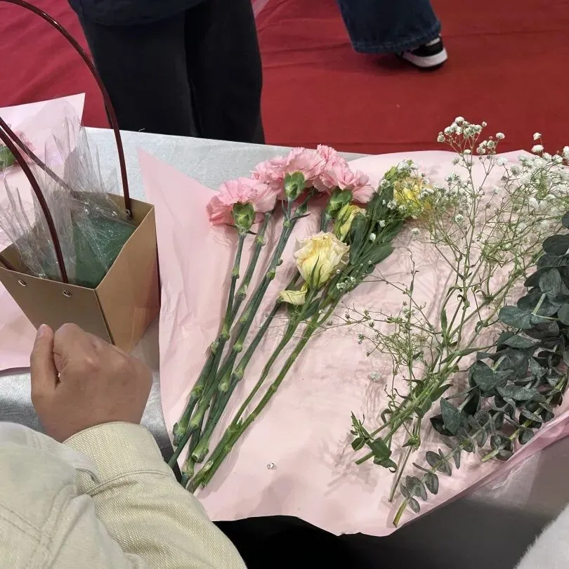 满桌的玫瑰、康乃馨、洋甘菊与尤加利叶,