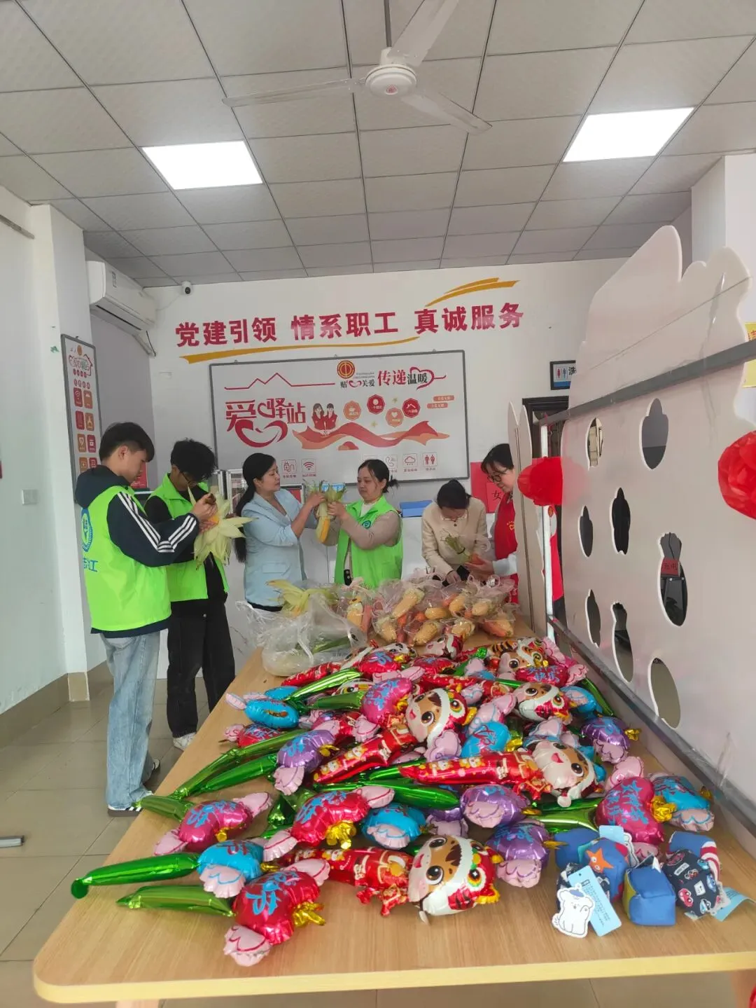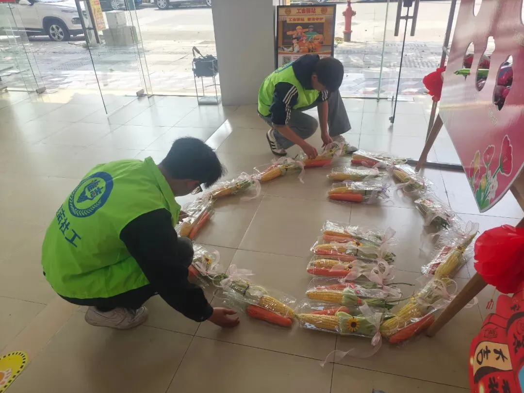 活动准备阶段充满了欢声笑语,志愿者们纷纷施展巧手,将一根根玉米巧妙变装成别致的花束,整齐地摆放成一个心形的图案,令人心旷神怡。这样的创意布置不仅增添了节日气氛,也为活动现场带来了温馨与美好。