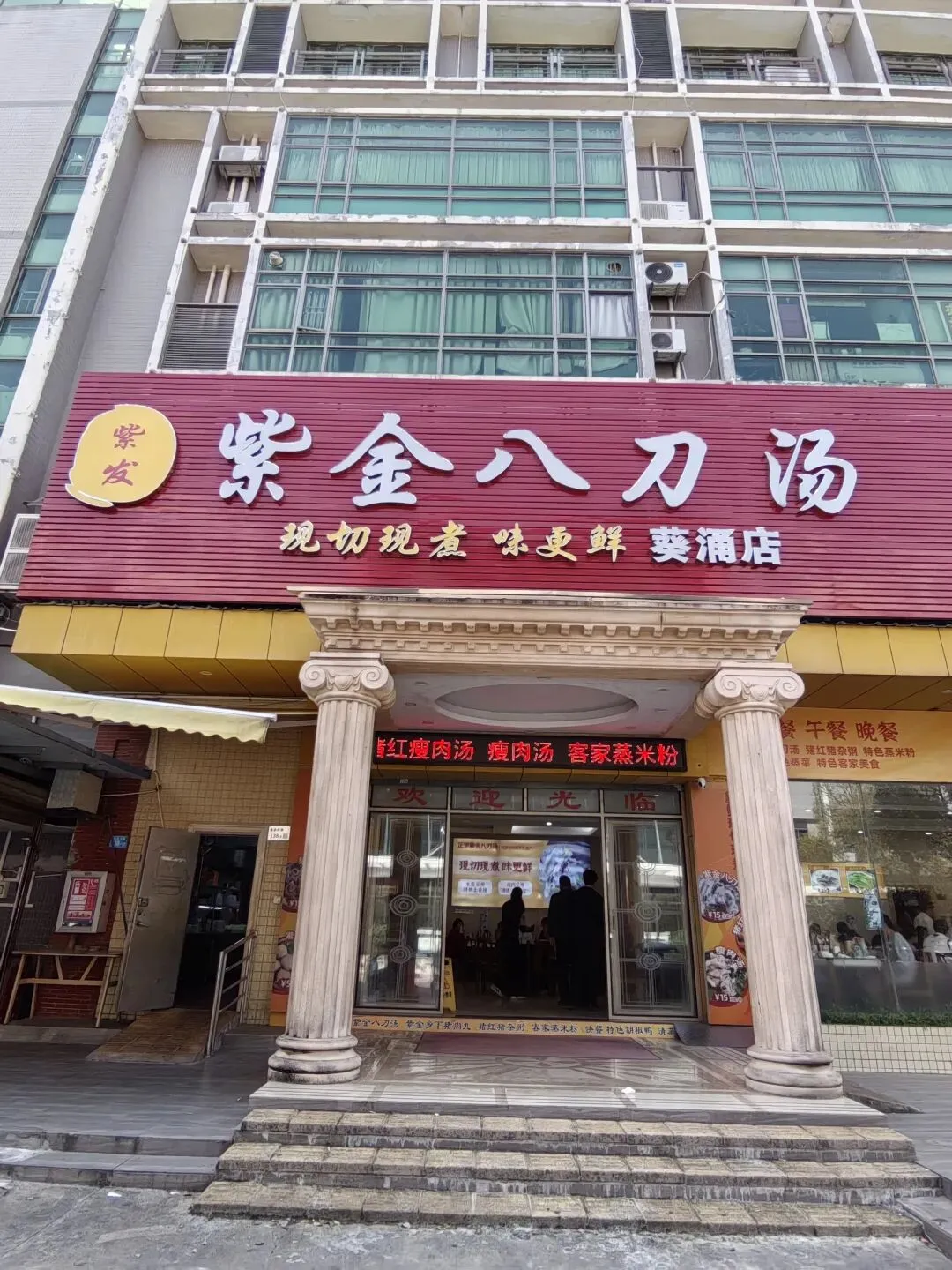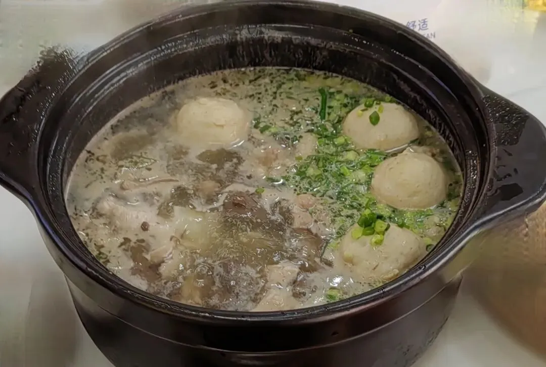 店里座无虚席,吃早点的人很多。不一会儿,一大盆汤水沸腾着的紫金八刀汤,端上了桌。伊伊的先生小范酒介绍,这盆汤,由八样猪身上的食材熬制而成,有猪心,猪肺,猪腰,猪肠,猪肝,猪肚,猪血,猪肉丸等。配料有河粉,细粉,方便面,生菜,蒸红粉等。