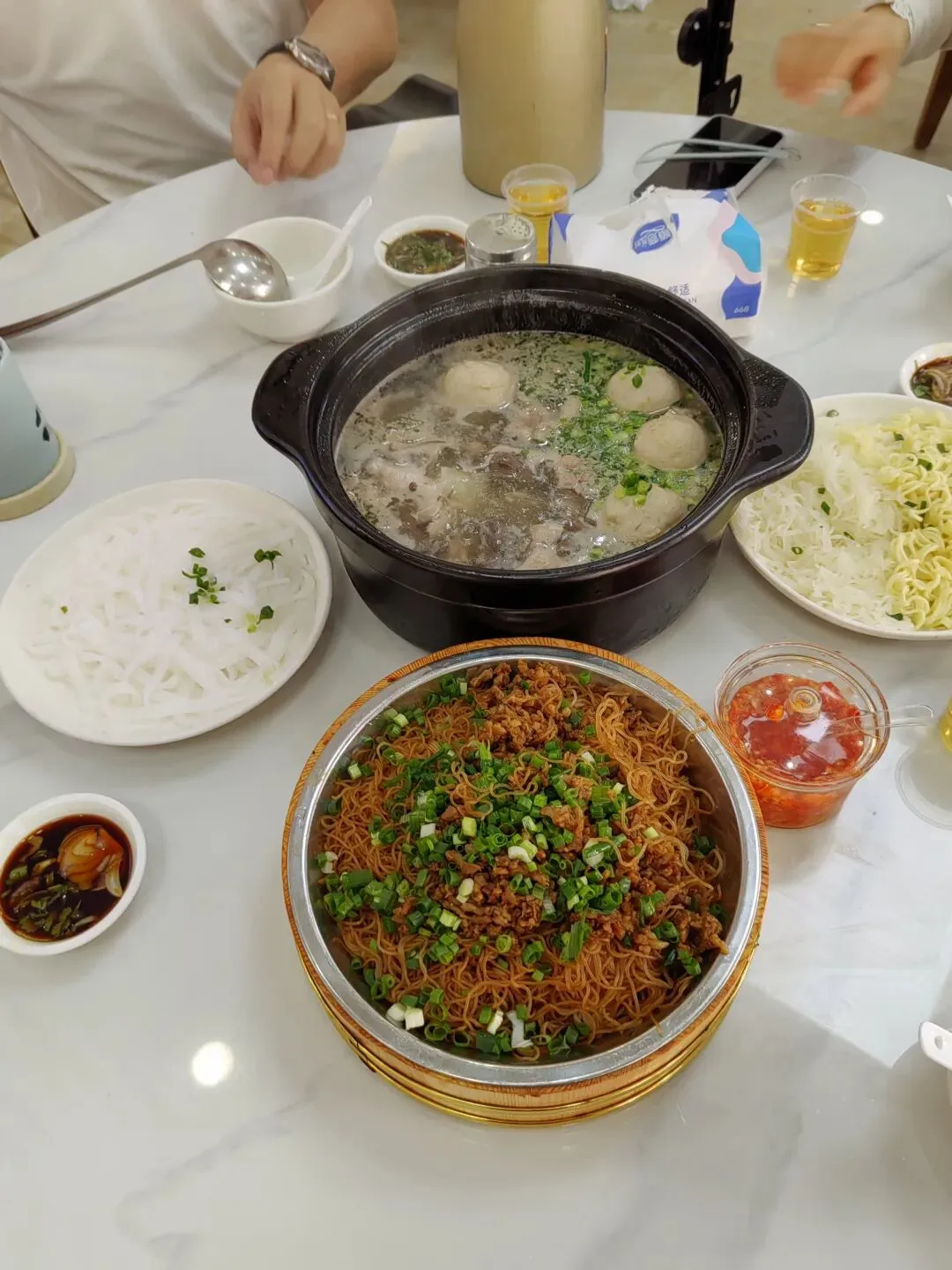 把配料夹到碗中,浇上滚烫的八刀汤,根据各自的口味,粘上调料吃。我们按照程序,细细品味。汤很鲜,粉细嫩绵软而有劲道。广东的早点,在保留传统的基础上,与时俱进,不断发扬光大,确实名冠天下。