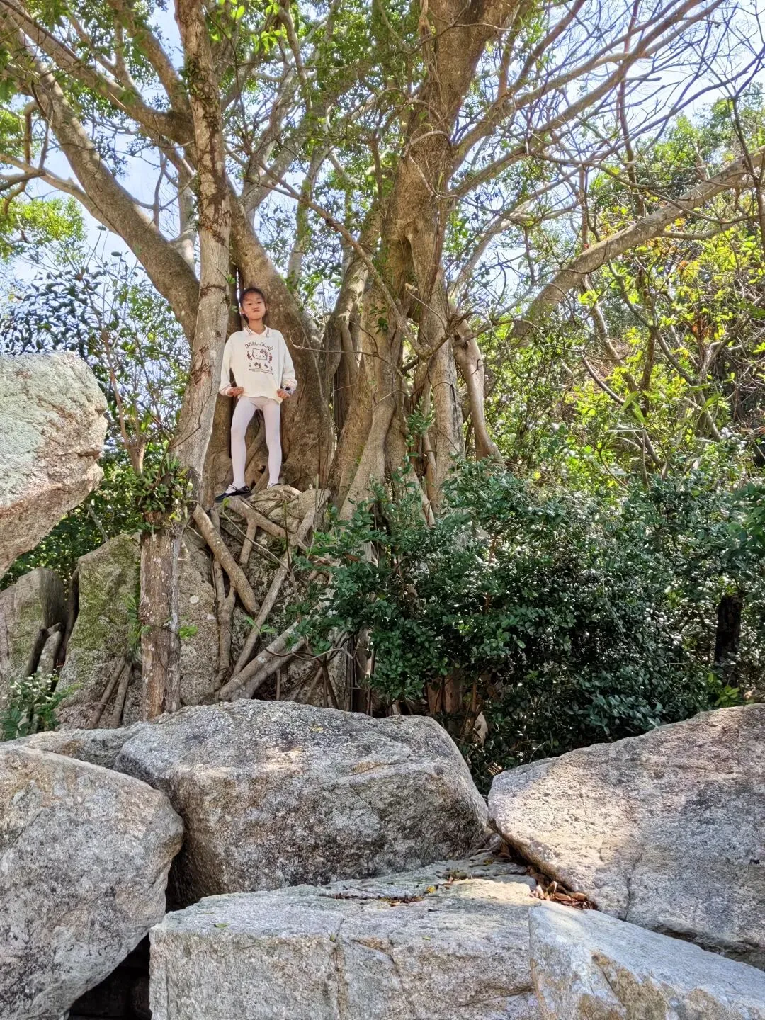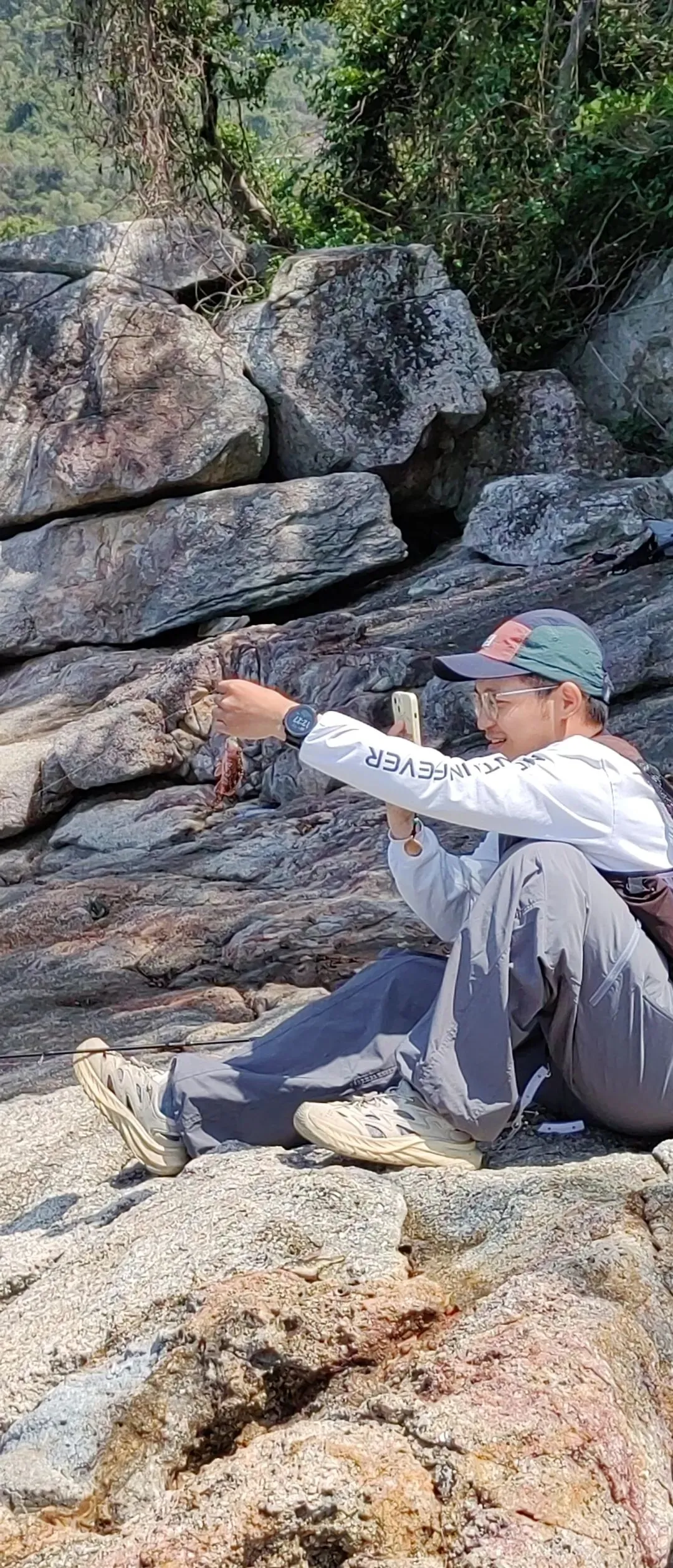 我们想走近去看看他们掉到了啥鱼,于是,时而跳跃,时而攀爬,使出浑身解数,十八般武艺,来到了垂钓者身旁。没多久,一条石九鱼被掉了上来。“哇,这和我们前几天在惠东港口镇买的鱼是一样的,蒸着吃,煮汤吃,味道都很鲜美。”我惊喜地说。
