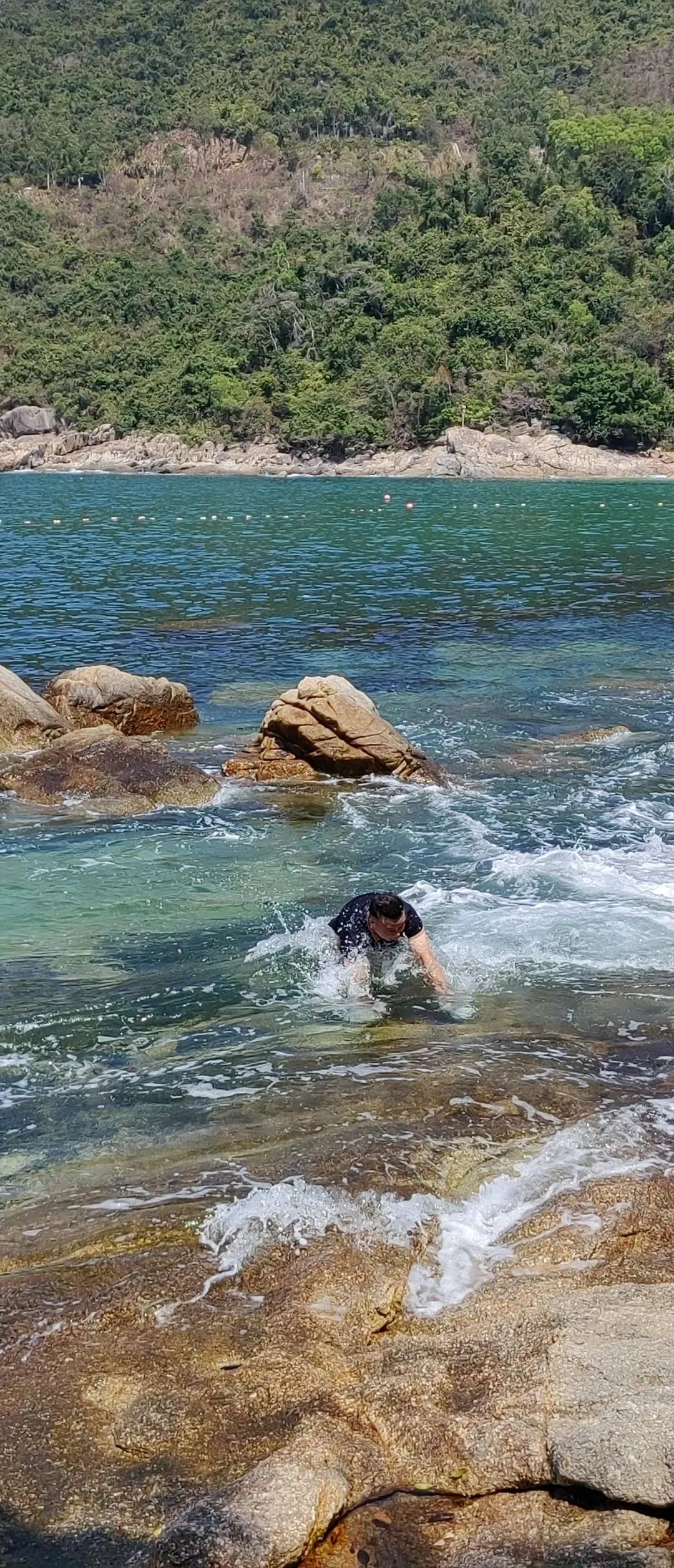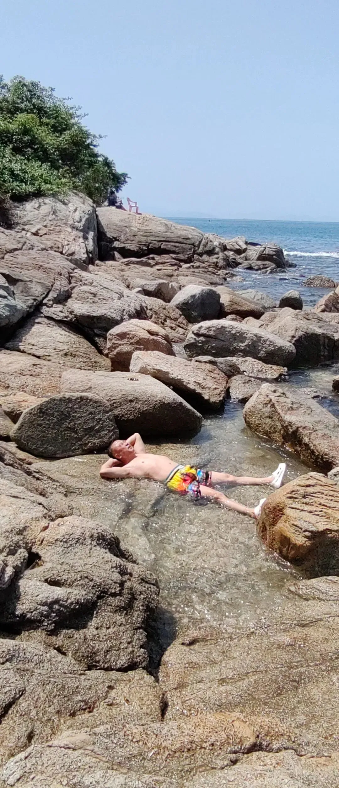 看完钓鱼,我们原路返回沙滩。我加入悠悠的挖沙运动。龙飞穿着沙滩短裤,躺在礁石的水坑里,闭上眼睛和嘴巴,享受海浪的拍打。一个浪头打来,海水从鼻孔里灌到了嘴巴里,“哇,海水好咸啊!”只见他一边叫着,一边鲤鱼打挺般坐了起来,双手快速地抹着头上脸上的海水,很是狼狈。