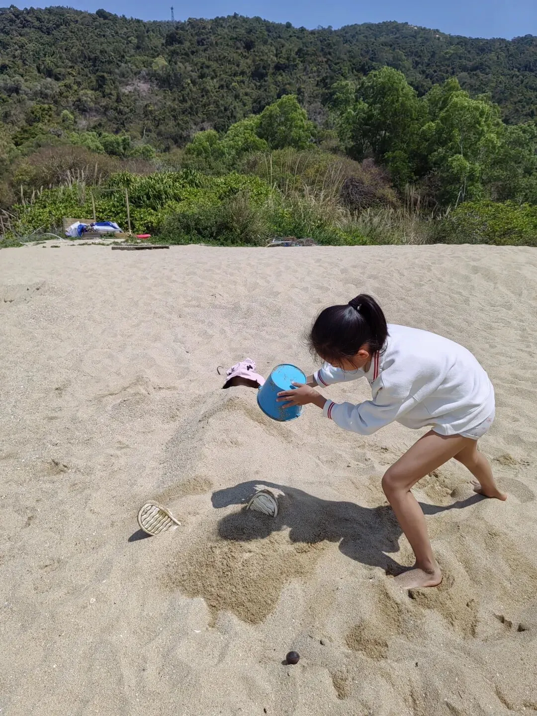 龙飞在海水里泡了一阵,又跑到沙滩上去晒太阳。我和伊伊、悠悠,跑过去,用沙子把他埋了起来,只剩一个头在外面,美其名曰,泡沙沐。为了不把脸晒的太黑,用帽子盖住了他的脸。不知过了多久,龙飞从沙堆里爬了起来,为了把身上头上的沙子洗掉,他又躺到了海水里,任由海浪拍打。我和伊伊躺在垫子上晒太阳,悠悠继续她的挖沙工作。
