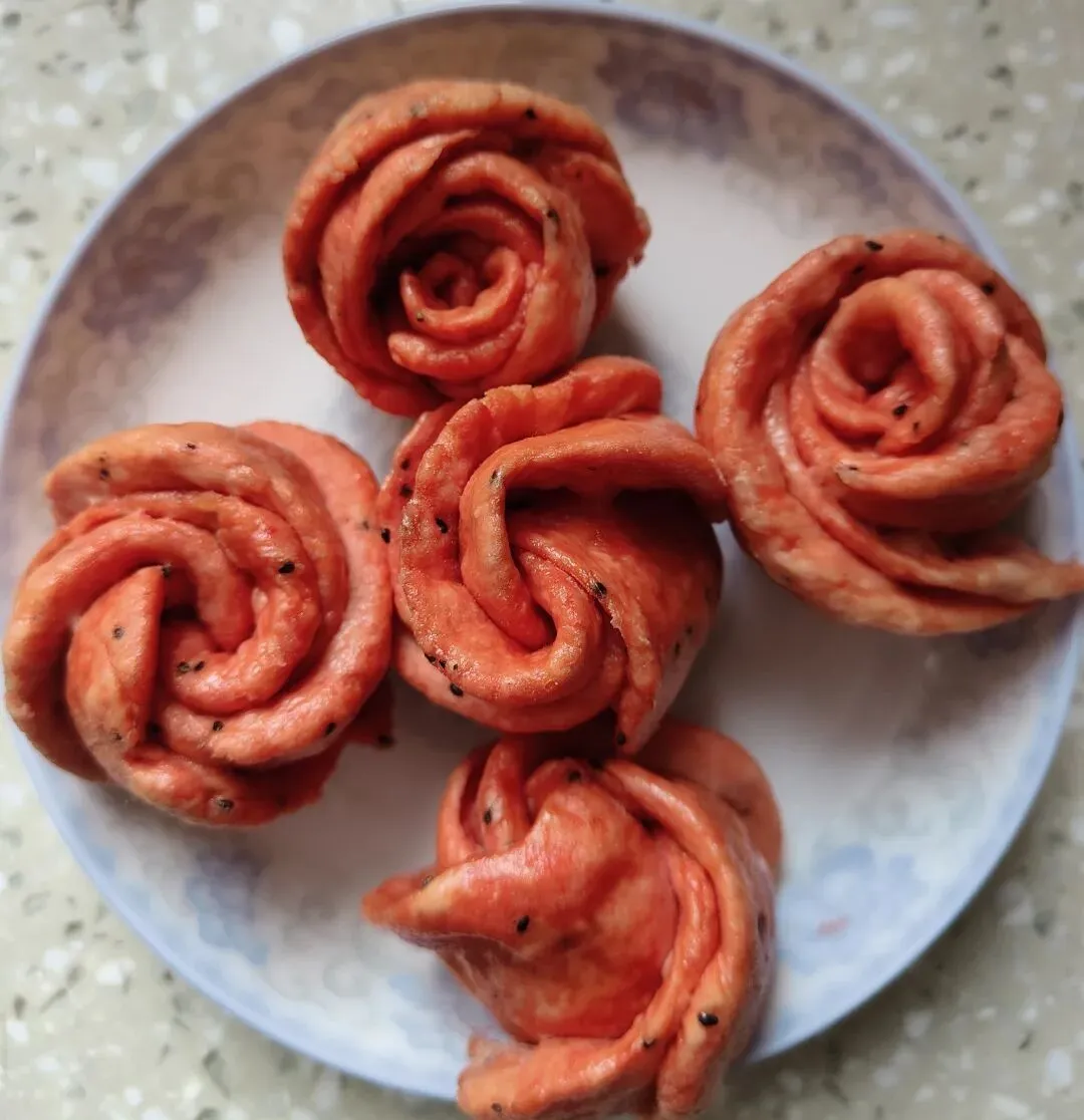 白面那盆醒发的较快,因为化酵母的时候加了温水,那就先蒸白馒头,老刘要葱花卷,做了一锅花卷,还有一锅做成了仿千层莲花和小花朵混合,会弄成啥样就啥样吧!火龙果汁的那盆,本来想做成桃心状,有一个装过巧克力的桃心状盒子,但试了一下,不怎么样,今天女神节,还是做玫瑰花🌹吧,为了保持形状,想着面硬一些,谁知太硬了,也不大好把握性状,随它去吧!