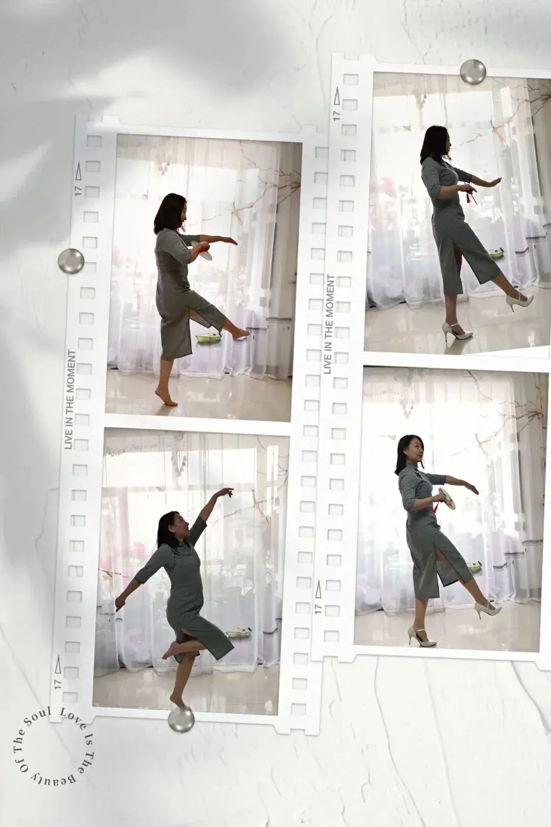 尉姐先在纱窗前翩翩起舞,又站到兰花前凭栏静听,她自己会摆姿势,一颦一笑都是风景,我只管找准位置,按动快门就行。