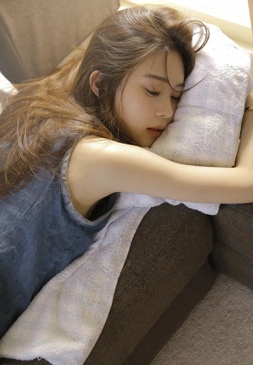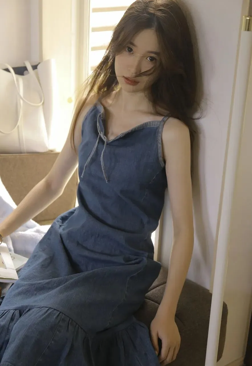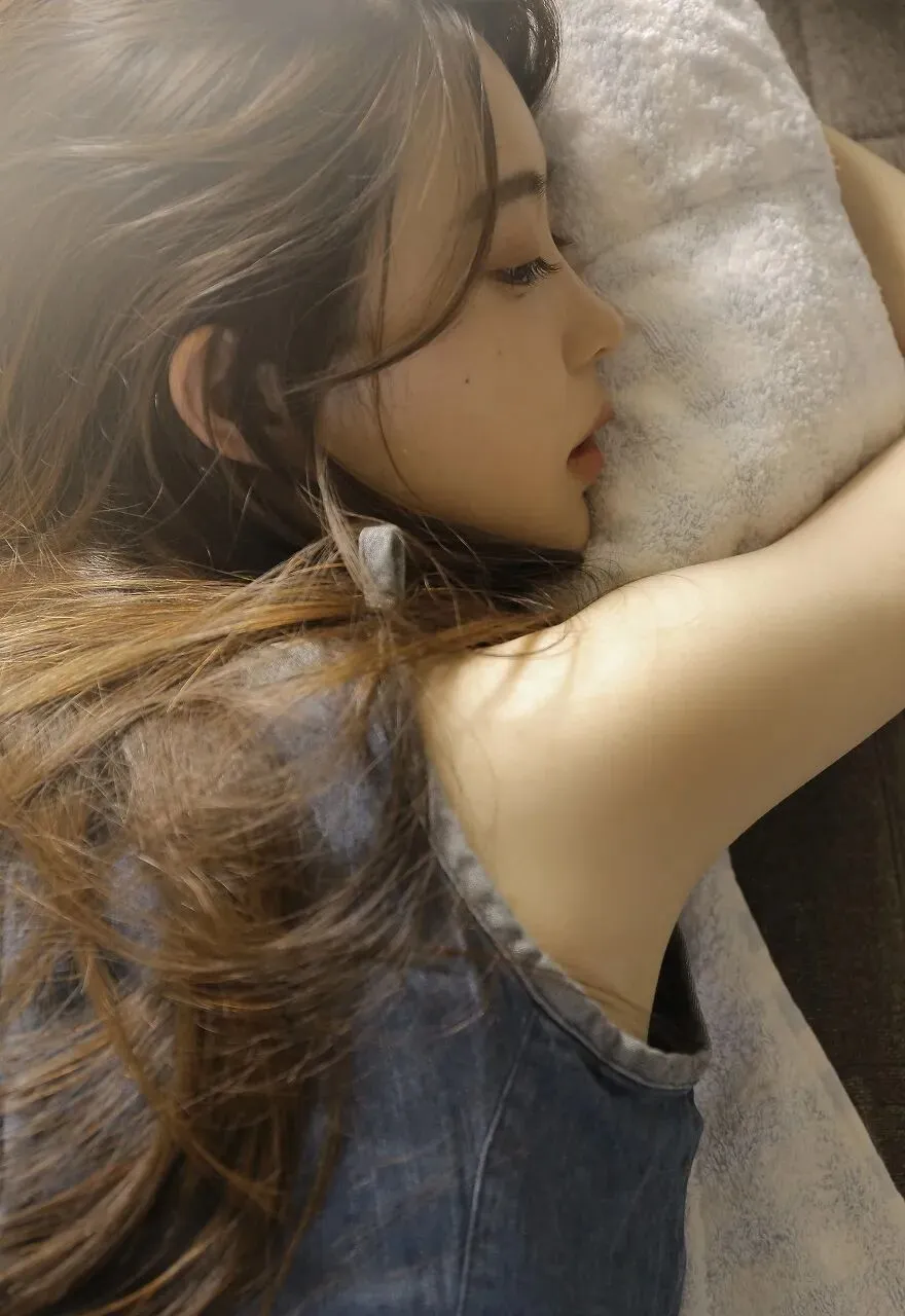 在生活的喧嚣与纷扰中,我们总在寻觅一方宁静的天地,能让心灵得以栖息,享受那份独有的闲适与安然。一个阳光温柔的午后,少女斜倚在窗边的沙发上,手中轻捻着细线,身上裹着柔软的毛毯,宛如一幅静谧的画卷,散发着温柔的气息。少女身着一件简约的牛仔无袖连衣裙,牛仔的蓝色如同晴朗天空的一角,清新而自然。连衣裙的材质带着一丝随性与洒脱,仿佛在诉说着少女不羁的内心世界。她的长发如瀑布般自然垂落,发丝在阳光的轻抚下闪烁着柔和的光泽,几缕碎发随意地散落在脸颊旁,为她增添了几分慵懒的妩媚。她斜倚在蓝绿色的靠枕上,姿态放松而惬意。手中拿着一根细线,似乎正在专注地进行着某种手工活动。她的眼神温柔而宁静,目光落在手中的细线上,仿佛整个世界都只剩下这一方小小的天地。她的表情平静而满足,嘴角微微上扬,带着一抹淡淡的微笑,仿佛在享受着这片刻的宁静与美好。
