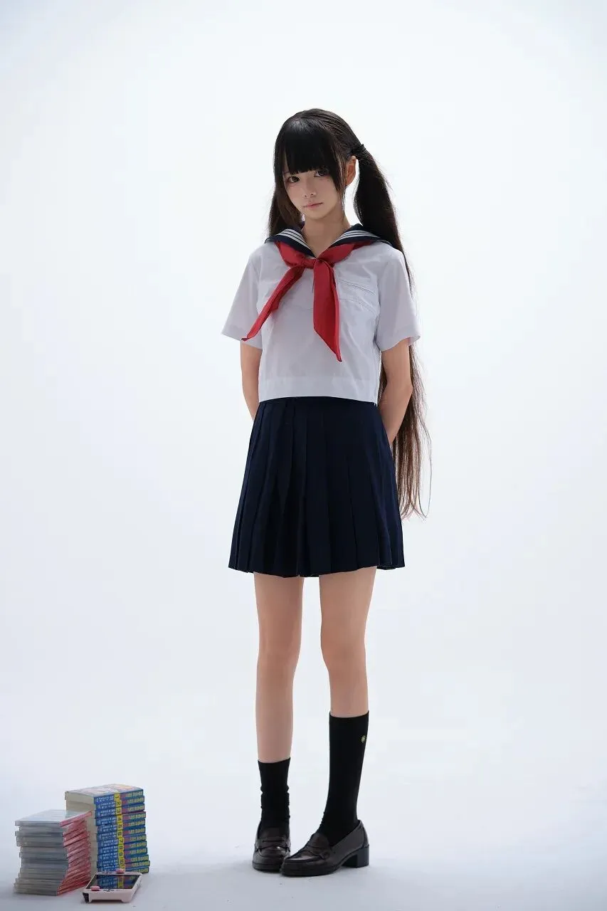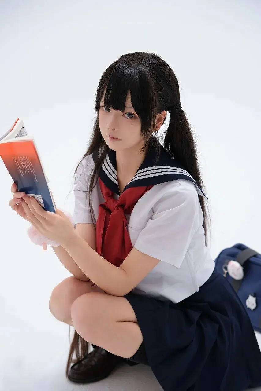 青春,是一首永不褪色的诗,是一幅绚丽多彩的画。在时光的画卷中,有一位身着日本水手服的少女,如同一朵盛开的樱花,带着独有的清新与纯真,走进了我们的视野,唤起了那些关于青春的美好记忆。少女身着一件洁白的短袖水手服上衣,领口处深蓝色的镶边与白色的布料形成鲜明的对比,如同蓝天与白云的邂逅,清新而明快。一条鲜艳的红色领结系在领口,为整体造型增添了一抹亮丽的色彩,仿佛是青春的热情在绽放。下身搭配的深蓝色百褶裙,随着少女的动作轻轻摆动,褶裥整齐而富有韵律,展现出青春的活力与灵动。她的长发乌黑亮丽,扎成高高的马尾,垂落在背后,发梢自然地微微卷曲,增添了几分俏皮与可爱。她的手中拿着一本翻开的书,书的封面色彩丰富,以橙色和蓝色为主色调,上面似乎有一些图片和文字,或许是一本漫画书,又或许是一本青春小说。书的存在,为少女增添了一份文艺的气息,仿佛在告诉我们,她在青春的旅程中,不仅有着外在的美丽,更有着内在的涵养。