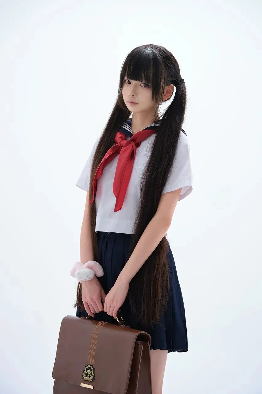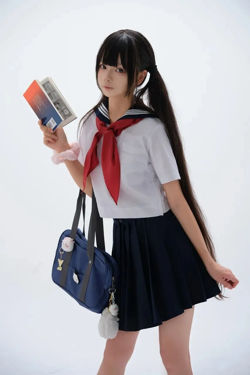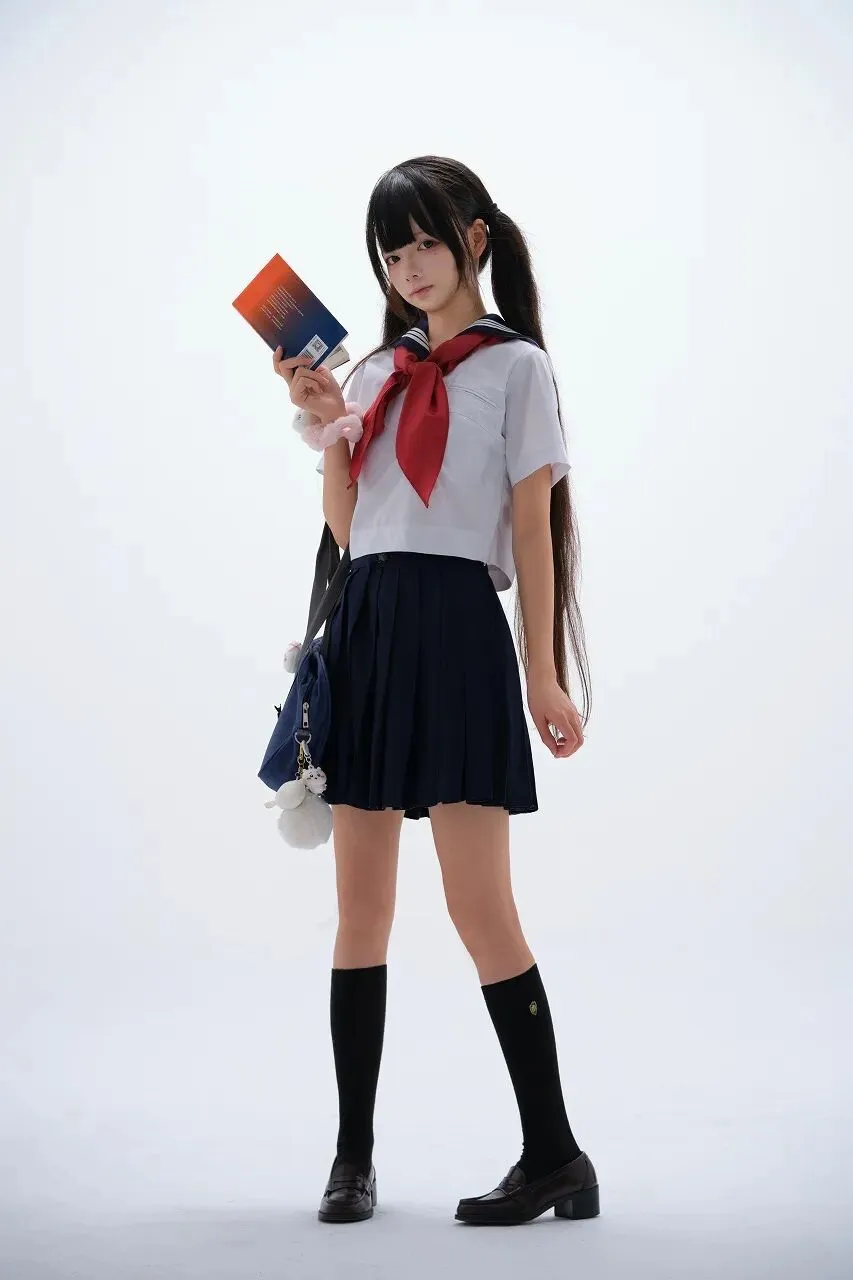 她的右手提着一个深蓝色的手提包,包上挂着几个可爱的挂件,有小猪形状的,还有毛茸茸的白色玩偶,这些挂件随着少女的步伐轻轻晃动,为整个画面增添了一份童趣和活泼。少女的姿态自然而放松,左手轻轻提起裙摆,眼神明亮而清澈,直视着镜头,仿佛在与我们进行一场无声的对话。日本水手服,作为一种经典的校园服饰,承载着无数人的青春回忆。它起源于西方海军服装,传入日本后,经过改良,成为了日本学校制服的代表之一。水手服的简洁设计与清新风格,与青春少女的纯真气质完美契合,成为了青春的象征。每当看到身着水手服的少女,我们的脑海中总会浮现出校园里的点点滴滴,那些青涩的暗恋、那些激烈的比赛、那些与好友一起度过的欢乐时光。对于这位少女来说,这套水手服或许是她校园生活的一部分,也可能是她对青春的一种表达。她穿着它,走在校园的小道上,坐在教室的课桌前,又或是像此刻一样,站在纯白的背景前,展现出属于自己的青春风采。水手服见证了她的成长,陪伴她度过了许多美好的瞬间。