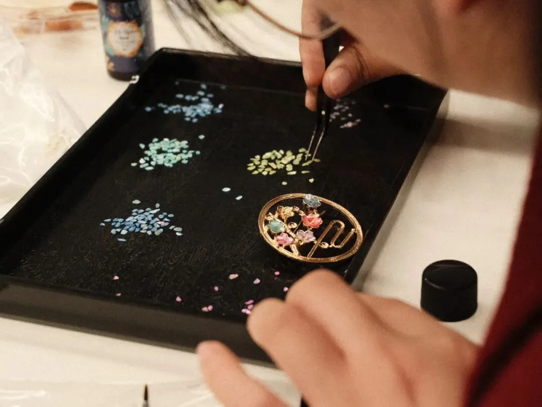 一双双从未触碰过螺钿的手,褪去平日的琐碎与拘谨,在斑驳陆离的贝壳盒里挑挑拣拣,仔细筛选。
