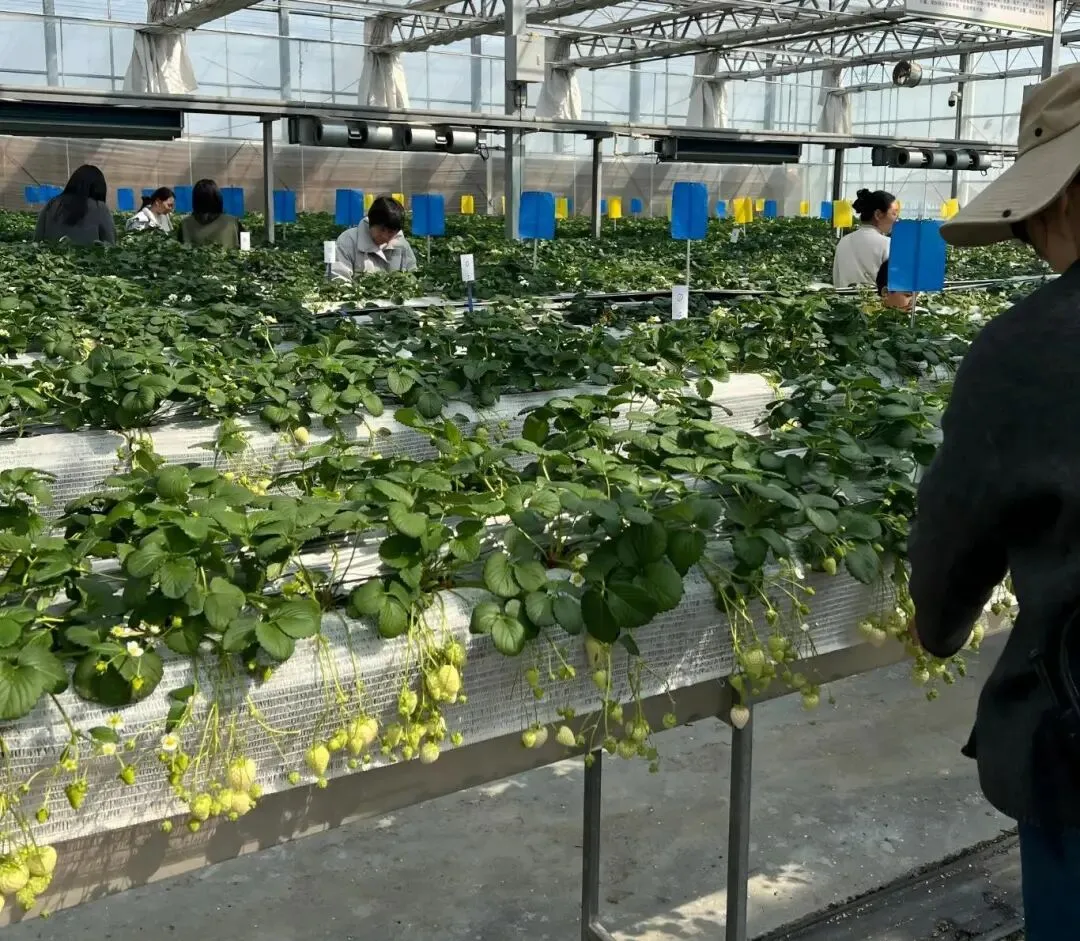 孩子们拎着小篮子穿梭在垄间,不时举着刚摘的草莓向家人展示~