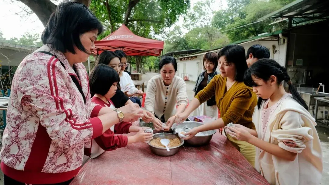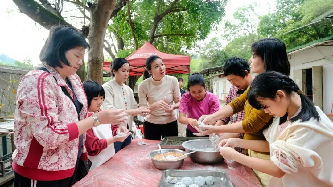大家揉面裹馅,亲手制作软糯青团,孩子们也在旁一起制作,欢声笑语不断。刚出炉的青团绿意清甜,众人共享春日美味,尽享阖家相伴的温情时光。