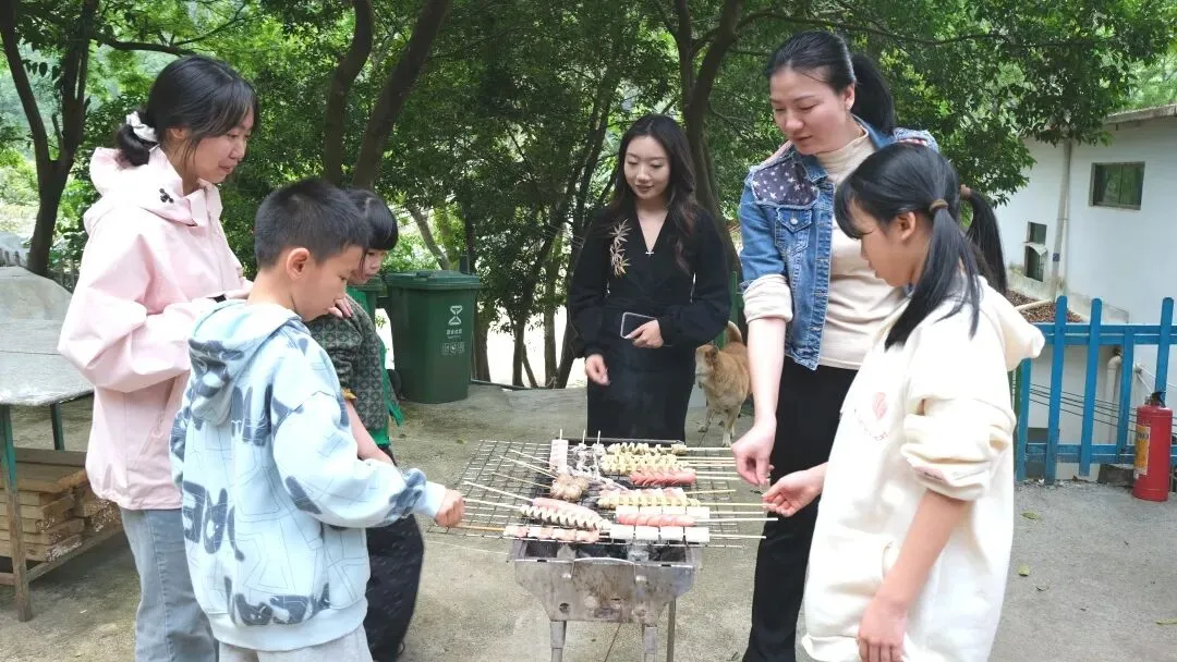 可爱的孩子们也沉浸式体验烧烤乐趣,小心翼翼帮着递食材、刷酱料,翻烤串,稚嫩的笑声伴着滋滋的烤肉声,吃的不亦乐乎。