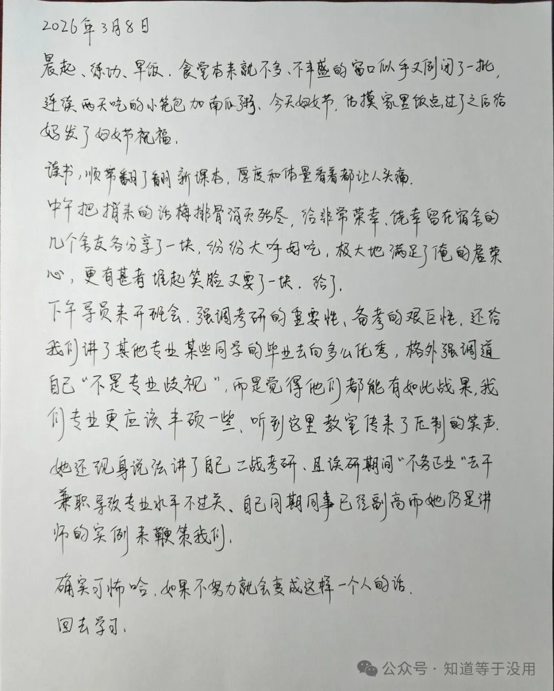 【转发语】女神节,给妈发祝福。中午,把排骨分给舍友,虚荣心满足。下午,导员开班会:讲考研压力,讲别人优秀,讲自己失败。听完,他写下“确实可怖哈”,然后回去学习。这才是真正的成熟:听完所有焦虑,还能安静地做自己的事。真正的努力,不是为了成为谁,是为了不成为谁。