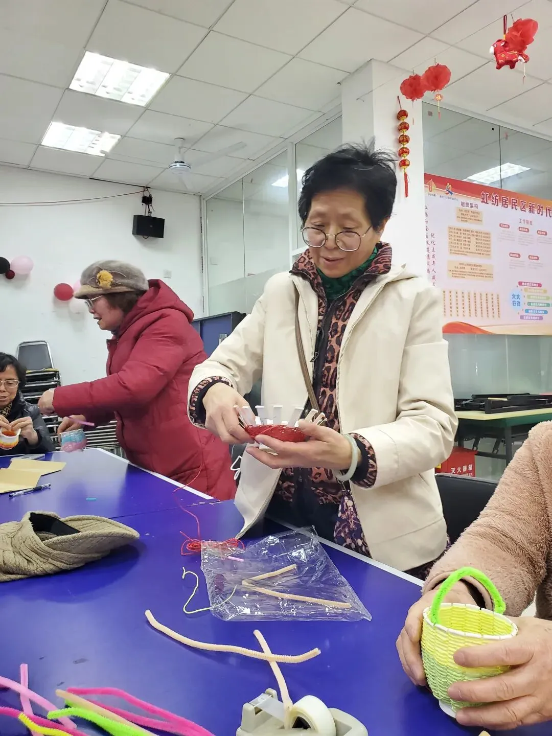 大家兴致盎然地挑选配色,有人偏爱明艳热烈的红粉,尽显优雅活力;有人钟情清新淡雅的蓝绿,透着温婉恬静。一篮一色彩,一花一心境,每一个成品都独一无二,藏着独属于长者的审美与巧思。最后,大家用柔软的扭扭棒弯折成小巧提手,轻轻固定在花篮两侧,柔软的质感恰似岁月沉淀下来的温柔与坚韧,让小小花篮更添灵动。