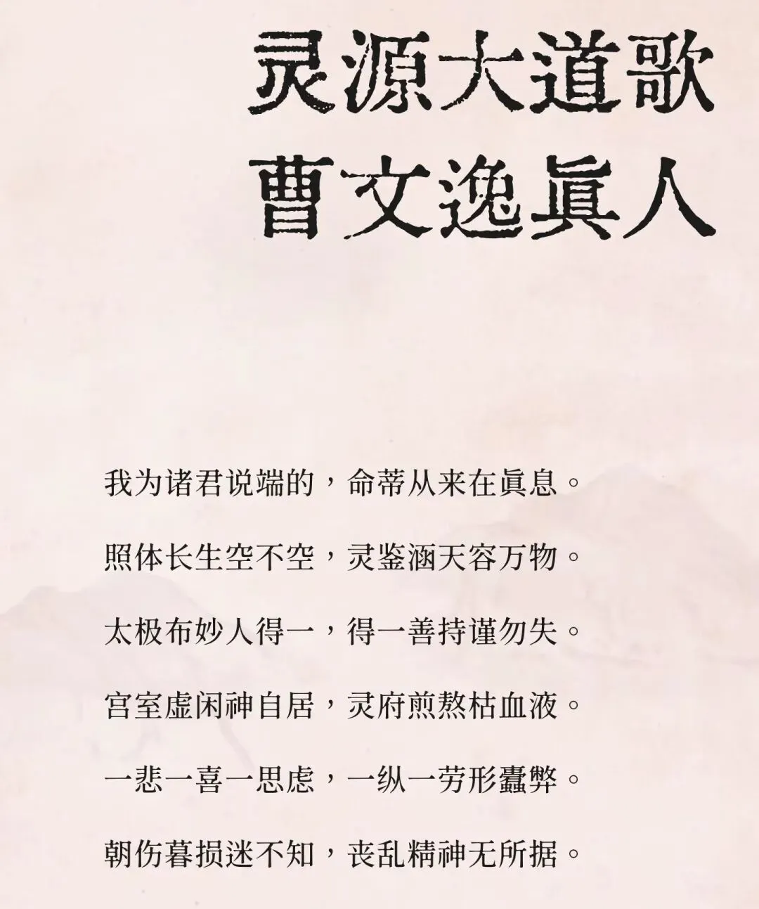6.曹文逸(1119――1126)为宋朝徽宗宣和年间的女道士,被敕封为“文逸真人”。《灵源大道歌》要比孙不二元君功夫次第诗早出几十年。“诚历代女真所著丹经之最古者也。其书阐扬玄理,发明丹道,皆能直指要妙,发其本根。”